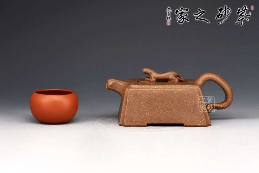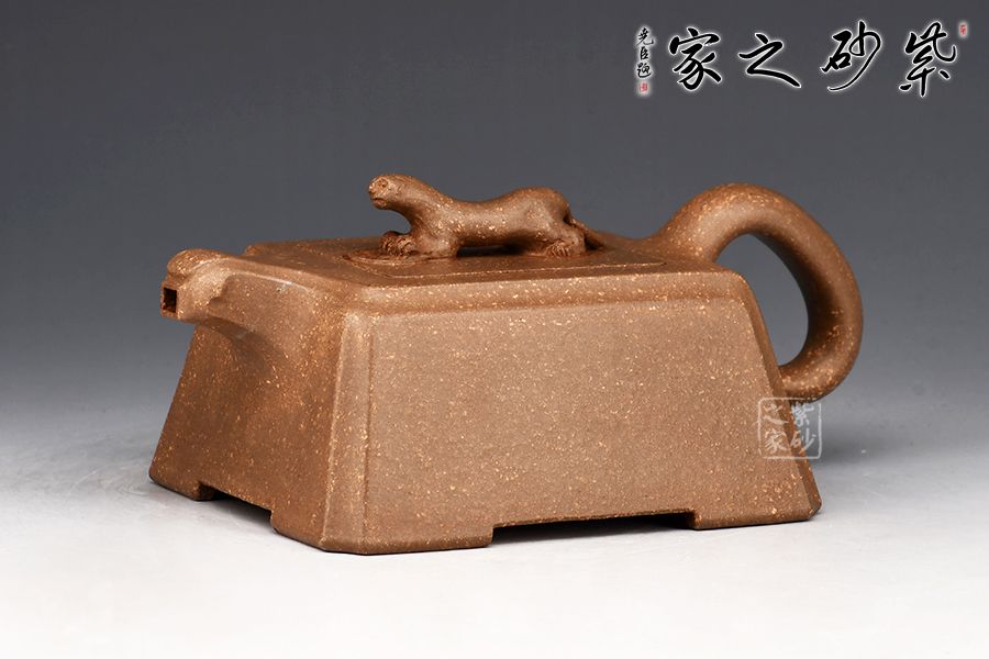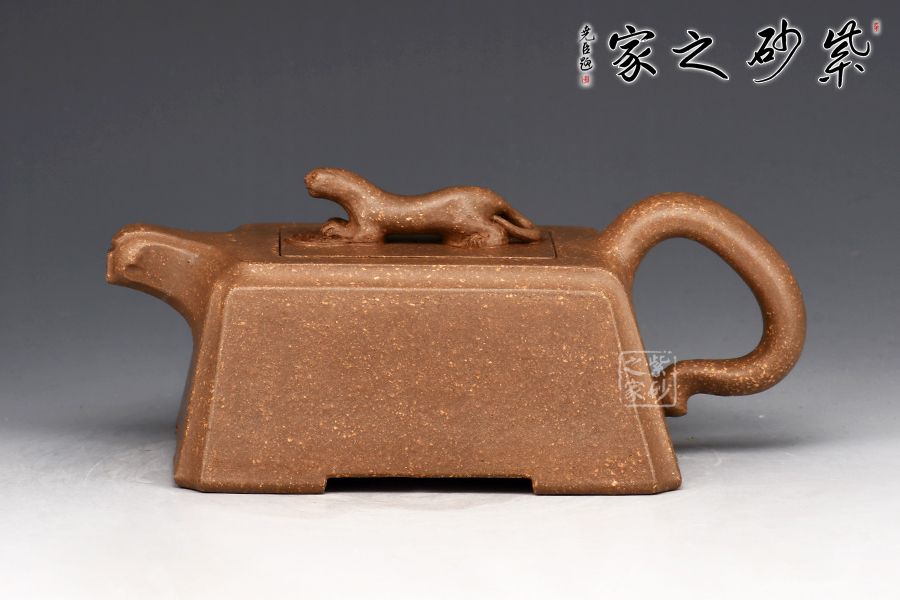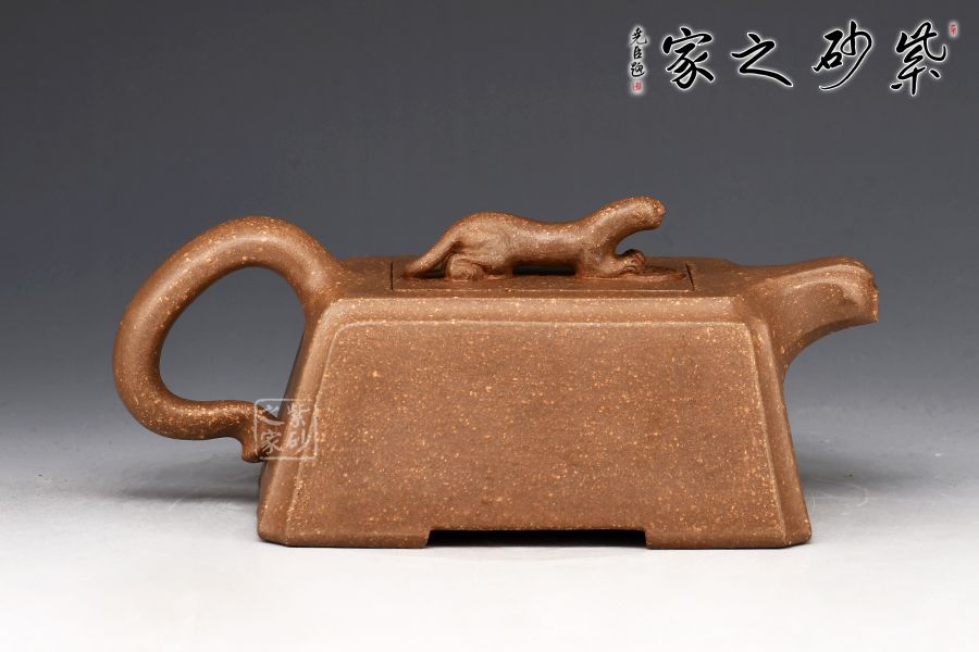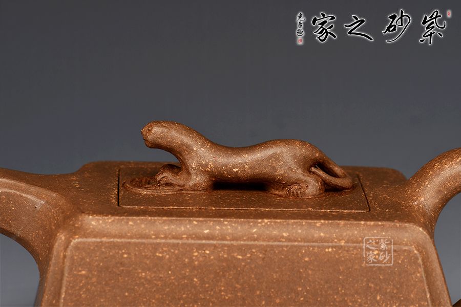 此壺以“豹”為形制,野性有力,生活動妙,昂首擺尾間氣勢不凡。壺身云梯見方,無一多余紋飾,規(guī)整大氣,短流加上不規(guī)則形態(tài)的執(zhí)耳猶如猛獸翹尾,方中不失靈動。