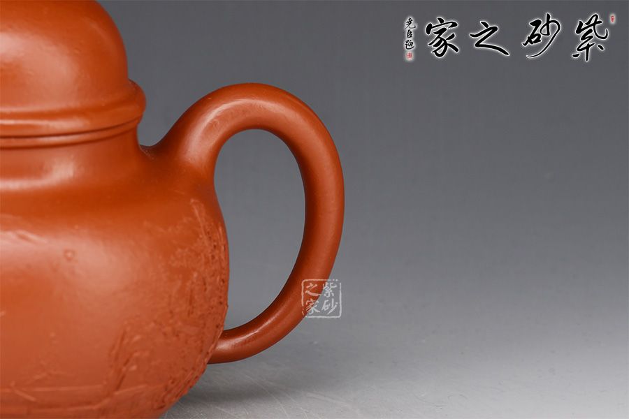 此壺有著渾圓的壺身,半圓的壺蓋,圓鈕,線條流暢,比例得當,壓蓋略微渾厚,點線之間見出魅力,子母線口蓋溫和嚴密,骨肉亭勻,簡練大方,制作頗見功力。彎流嘴胥出,在端頭下壓,柔美之姿明顯,壺柄略微上抬之后優(yōu)雅滑落而下,形成一條圓潤飽滿的弧線,樸雅大方。此壺集實用性和把玩性于一體,值得推薦。