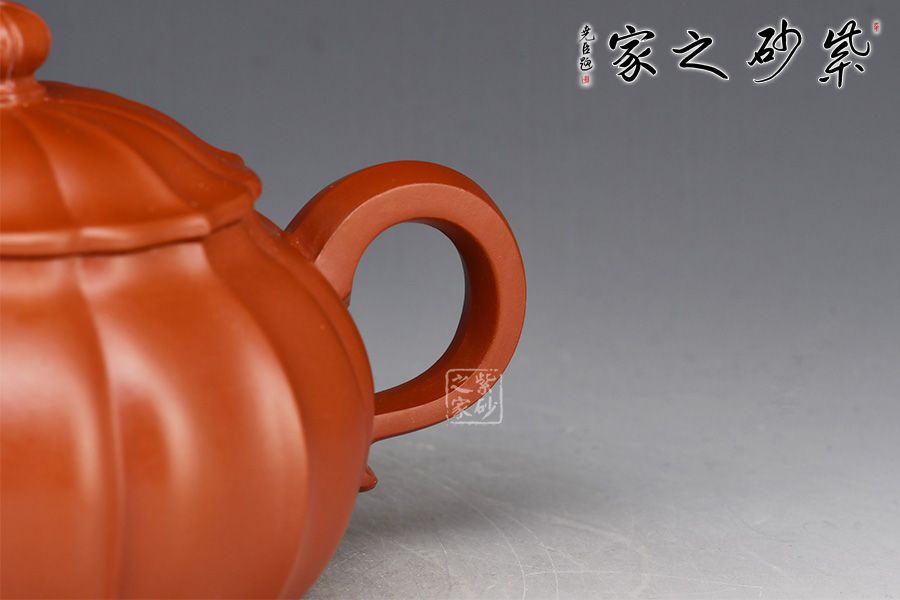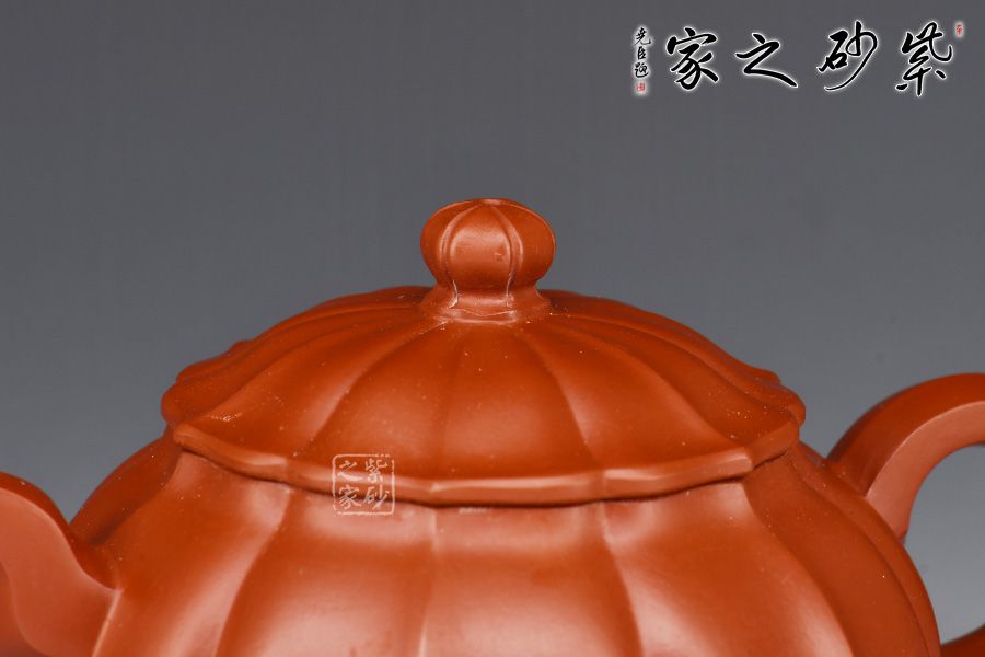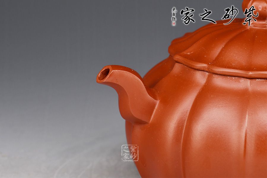 全壺形似含苞待放的菊花。從頸部到壺底的凹線均勻劃分,筋脈清晰、深淺自如。壓蓋與壺口嚴(yán)絲合縫,嚴(yán)絲合縫,貯茶密閉不滲水,開合順暢自在。