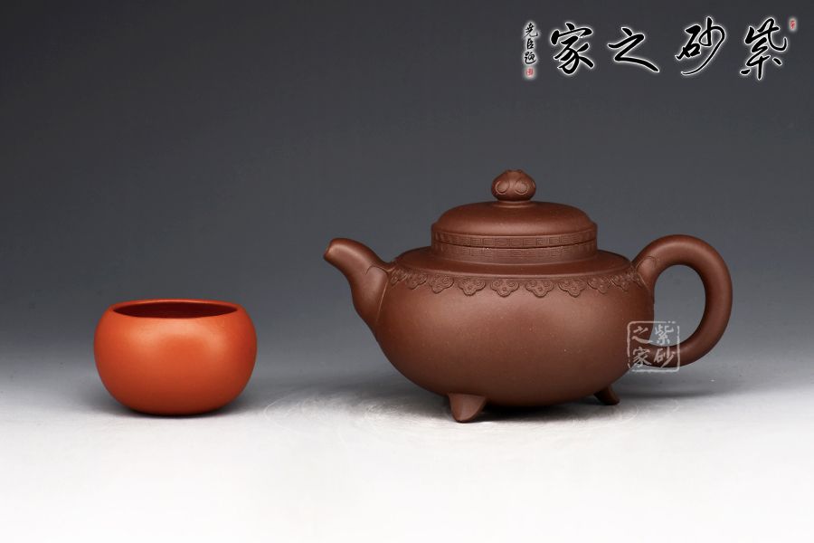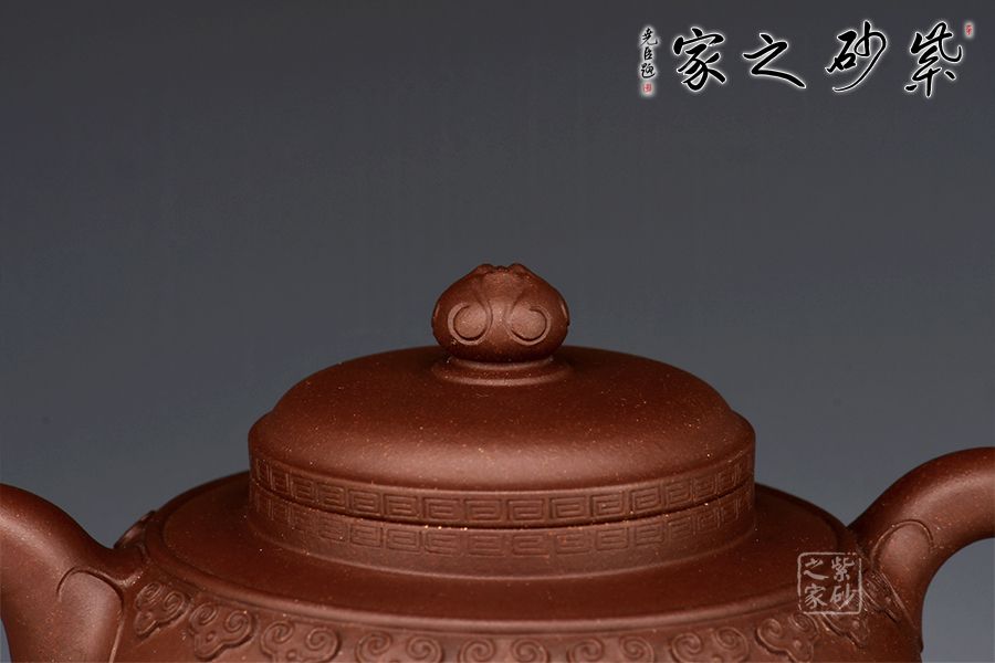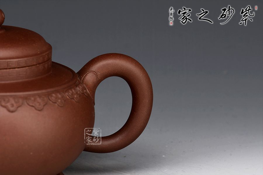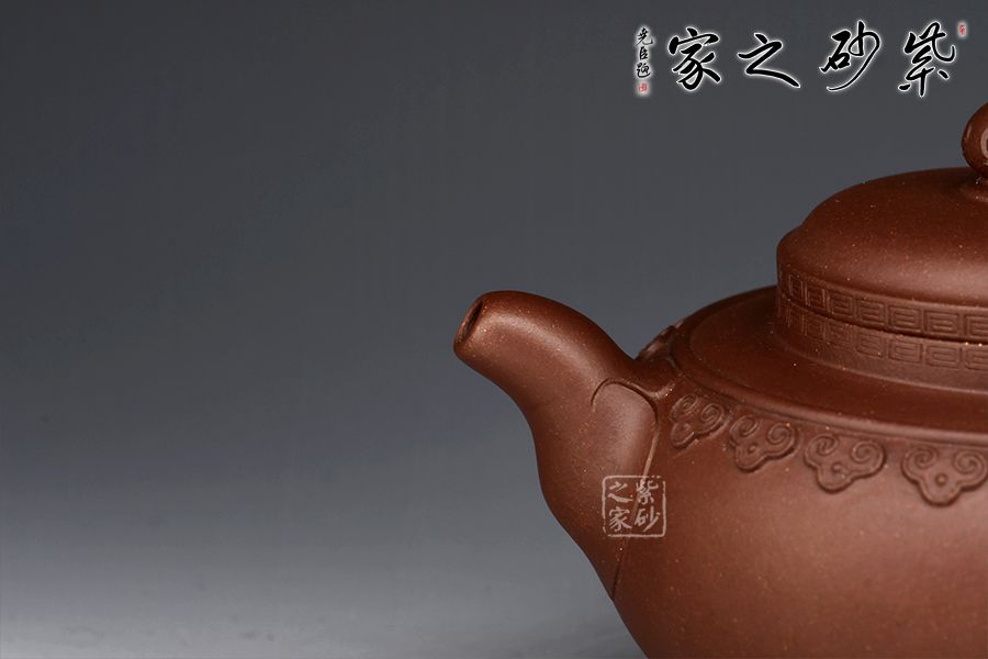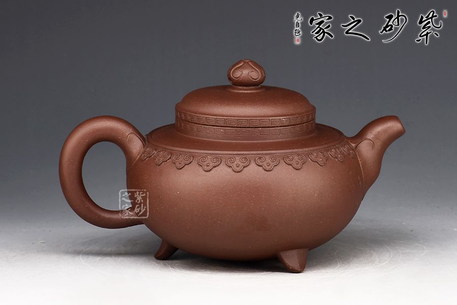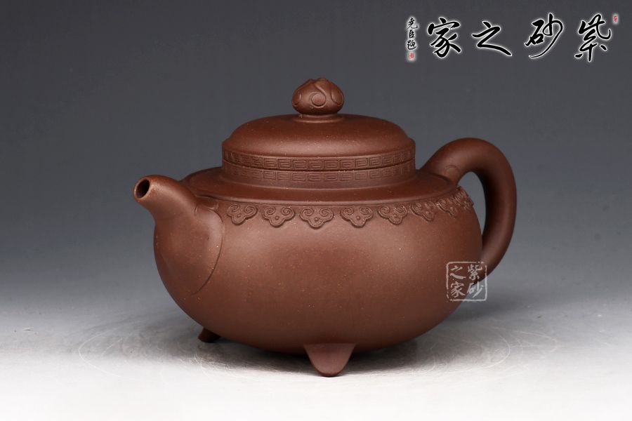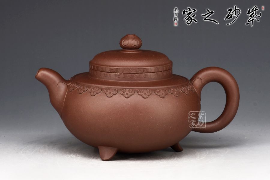 云肩如意體現(xiàn)了一種溫和而古雅的氣質(zhì),器型端莊秀氣,圓潤飽滿的壺身被三足穩(wěn)穩(wěn)托住,把、鈕與嘴三點一線,協(xié)調(diào)有致,壺肩處圍繞一圈如意圖案增添了立體感,同時藝術效果強烈。整器自然樸素,胎質(zhì)細膩,加上原礦紫泥,使得作品更為的大方而端莊。