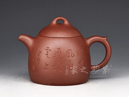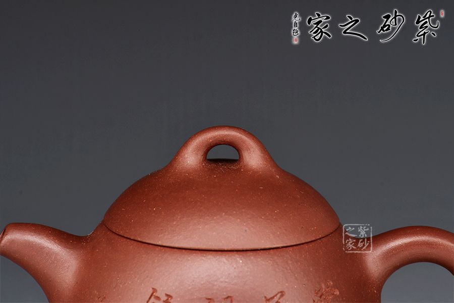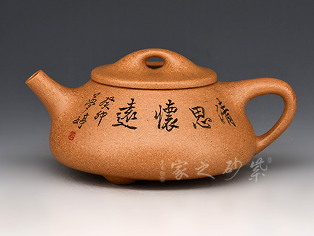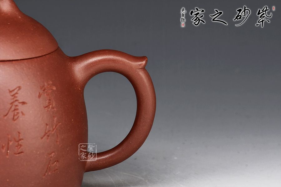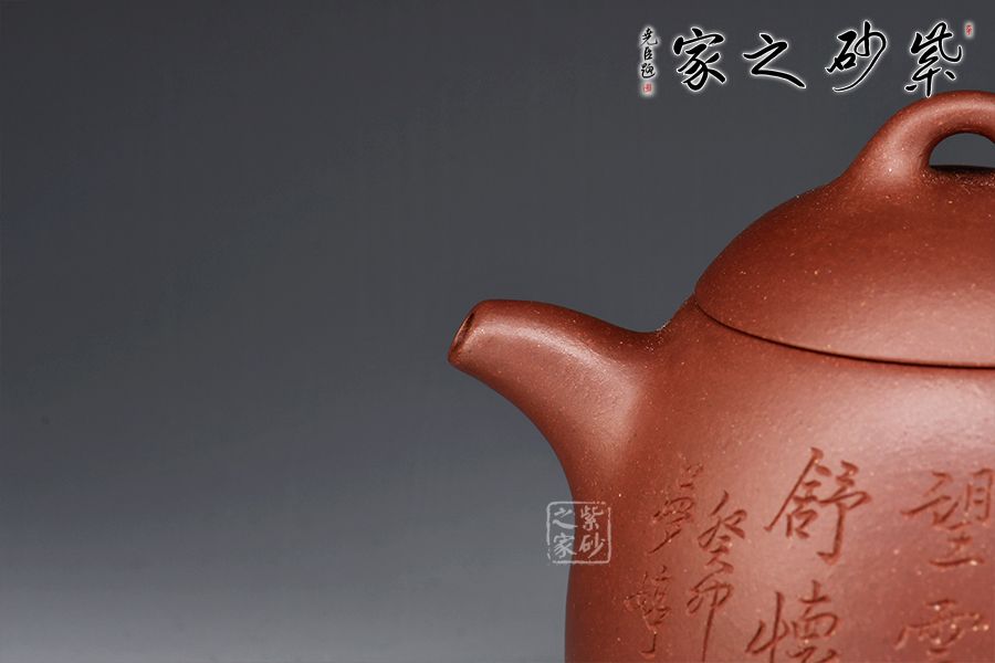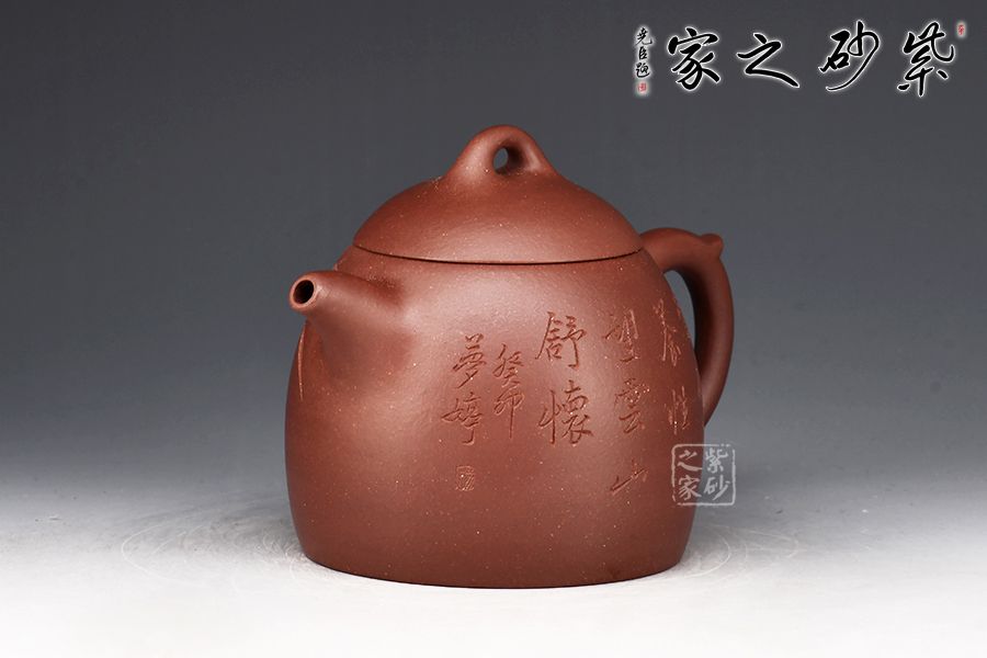 秦權(quán)壺,此款壺仿秤砣形制,壺身高聳由下至上收斂,自然流暢;流短有勁,環(huán)耳形把手,不矯不揚(yáng);截蓋微鼓,與壺身渾然一體;鈕似橋頂,壺形整體簡(jiǎn)練,古樸,大方,楊夢(mèng)婷老師的這款秦權(quán),借詩(shī)唱和,有古穆沉靜之感,更添了藝術(shù)的內(nèi)涵,整款作品大氣和美、線形流暢自然、力到十足,集實(shí)用與收藏于一體。