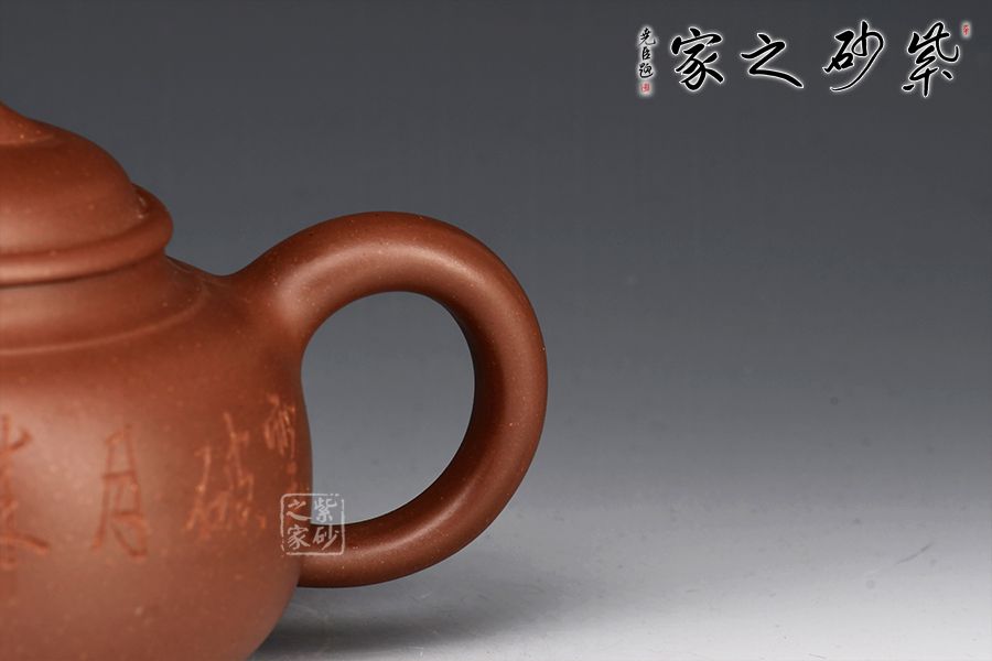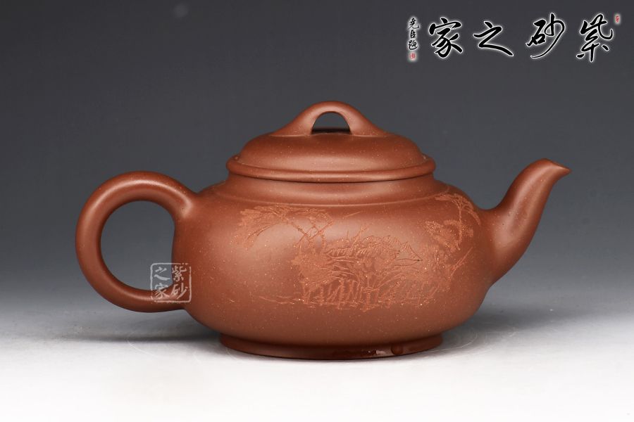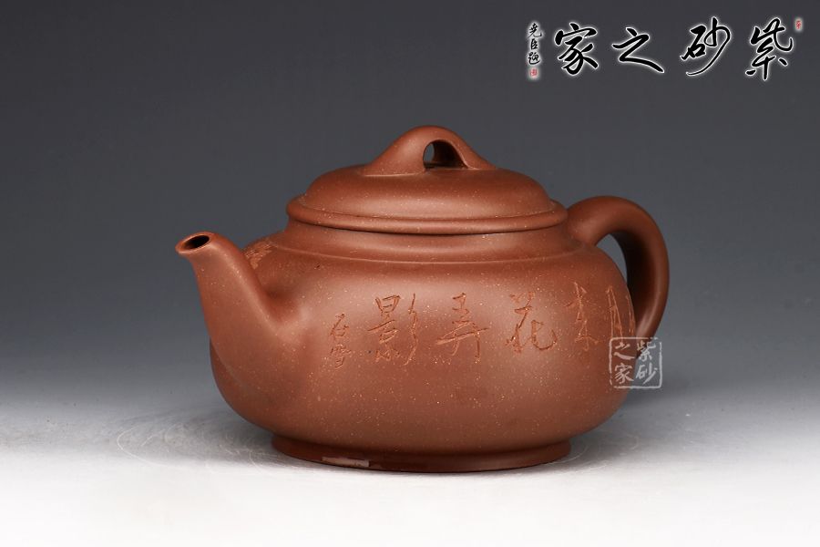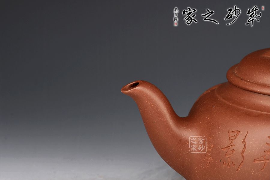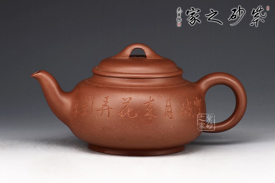 此壺壺身略扁,彎流自壺身蜿蜒而出,圈把抓握舒適,橋鈕壓蓋,大口蓋,投茶十分方便,壺身刻繪:云破月來(lái)花弄影。好工好料好壺,力薦!