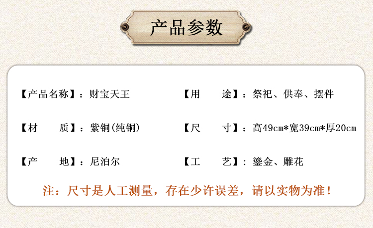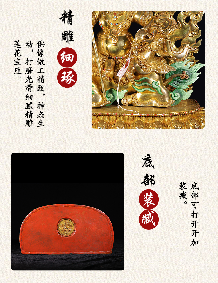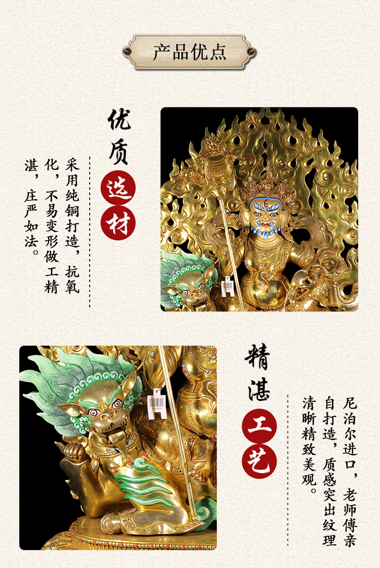 產(chǎn)地:尼泊爾佛像 工藝:紫銅 創(chuàng)作年份:2021 題材:財寶天王 繪制時間:0日 尺寸:20*39*49cm 重量:0 g 材質(zhì):紫銅 使用場地: