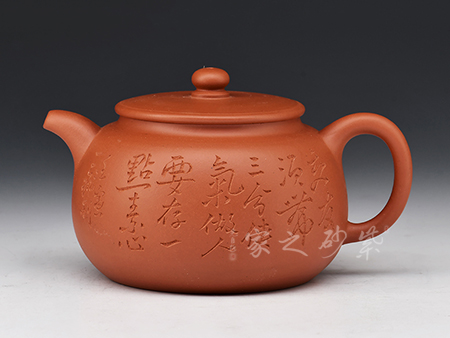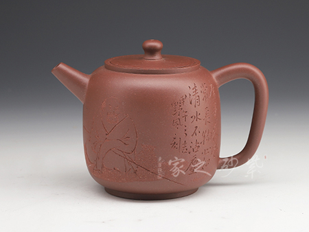 宜興紫砂以古樸素雅、宜茶等特點呈現(xiàn)于世人面前,又以獨特的制陶工藝、詩詞、書畫、篆刻相兼于一體的茶具,成為茶文化的組成部分。鑒賞宜興紫砂壺人們通常以“泥、形、工、飾”來衡量一件紫砂作品。劉一飛老師此專業(yè)全面,設(shè)計制陶、陶刻,尤擅裝飾,花鳥魚蟲、人物、山水無一不能,他主張?zhí)湛坍?dāng)講究“刀感” “筆意” 筆筆有意、刀刀見鋒,所刻內(nèi)容應(yīng)與器皿相得益彰,又力求能與把玩者之間產(chǎn)生共鳴為上品,他所刻的梅、蘭、菊似有暗香浮動,茗香、花香、數(shù)桿修竹又似一縷清風(fēng)拂面,好不愜意。人物兼工帶寫生動詼諧,似能與之家長里短。山水汲古人之風(fēng),丘壑亭閣、古木參天,人與自然共存共榮,如此佳境都源于老師多年書畫基礎(chǔ)。