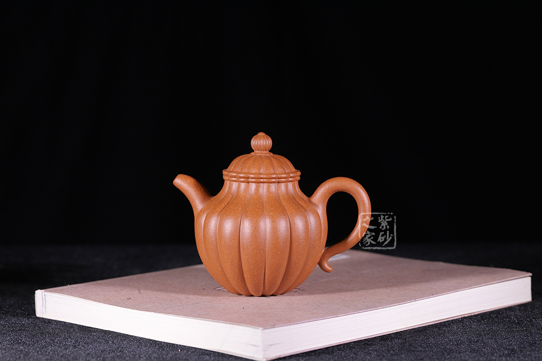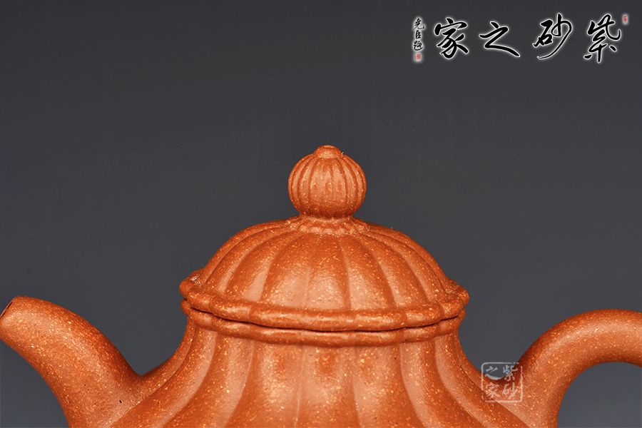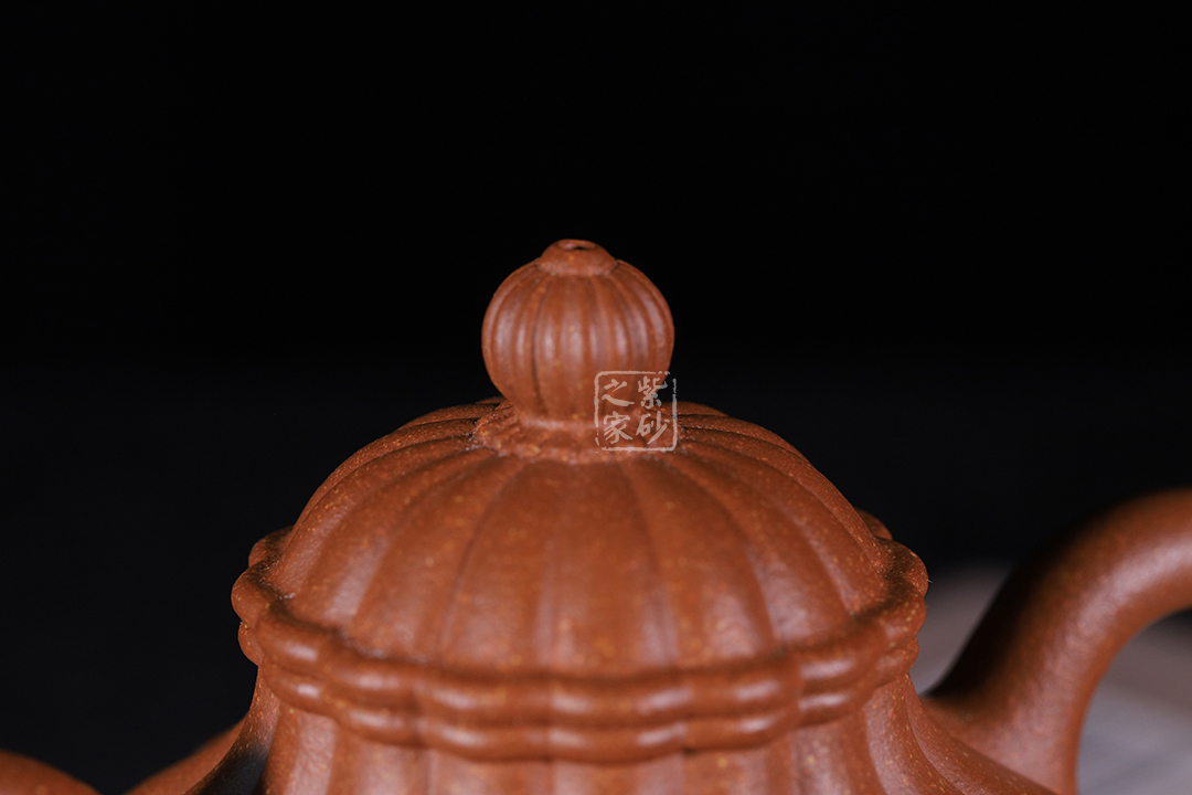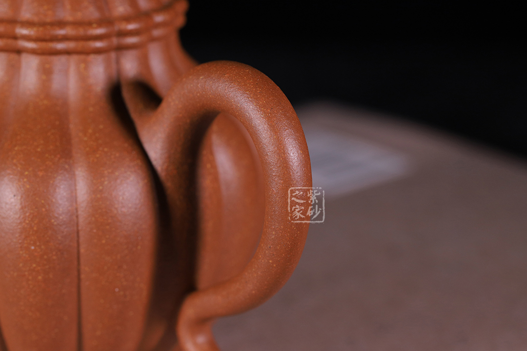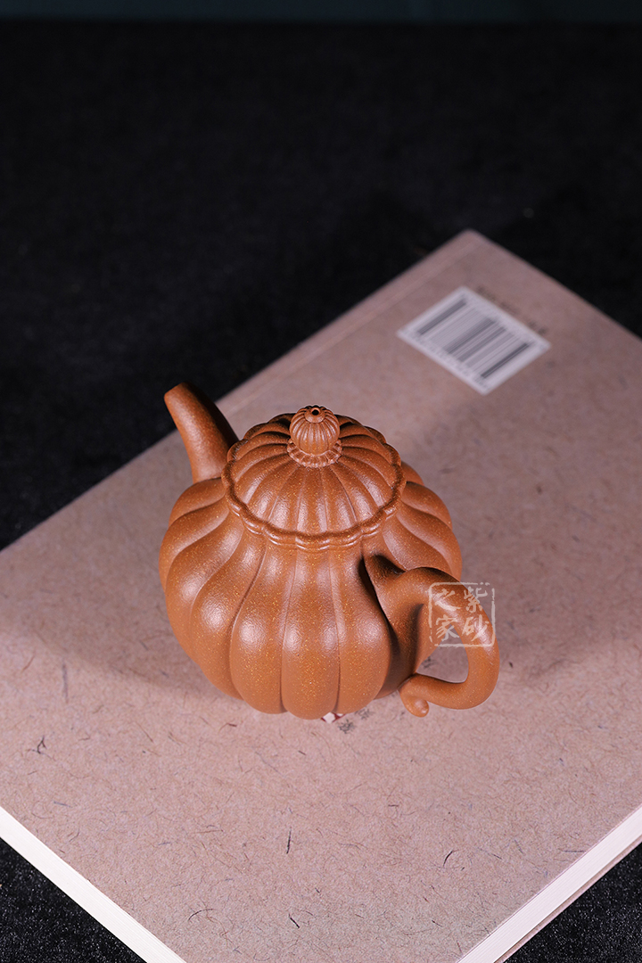 壺體為凹筋菊瓣,身、蓋、鈕均修飾為菊瓣式。壺身高挺,氣韻飽滿端莊,菊瓣自鈕而下至壺底貫通。低頸,沿筋紋走勢作出仿佛花瓣的姿態(tài)。壺蓋嚴(yán)絲合縫,可任由一個(gè)方向置換,瓣瓣通轉(zhuǎn)吻合,制作難度極大。壺流從菊瓣中伸展,流嘴上挺,壺把亦做昂揚(yáng),自然天成,秀姿優(yōu)雅。身、蓋、鈕三者比例由小至大,俯視可見層層相疊,自壺蓋頂珠延自底部內(nèi)包收束點(diǎn),可強(qiáng)烈感受其輻射狀的脈絡(luò)張力,徐徐律動(dòng)。