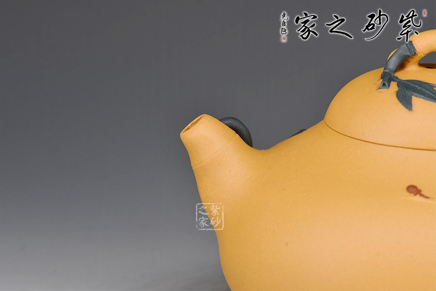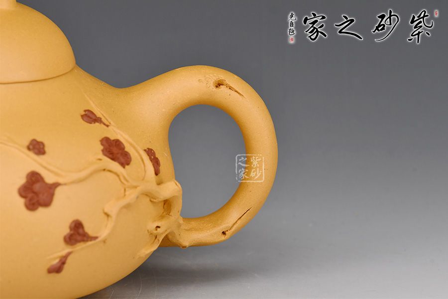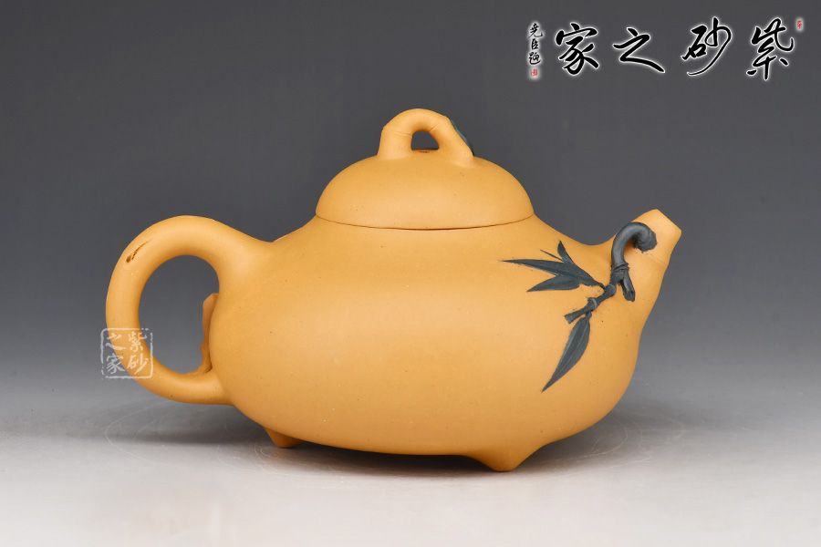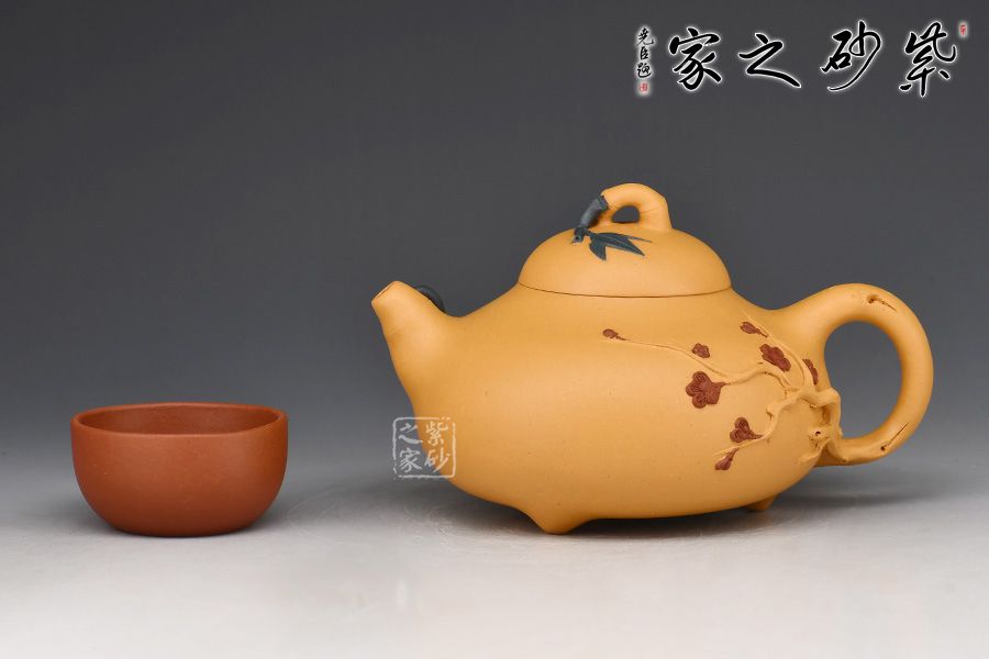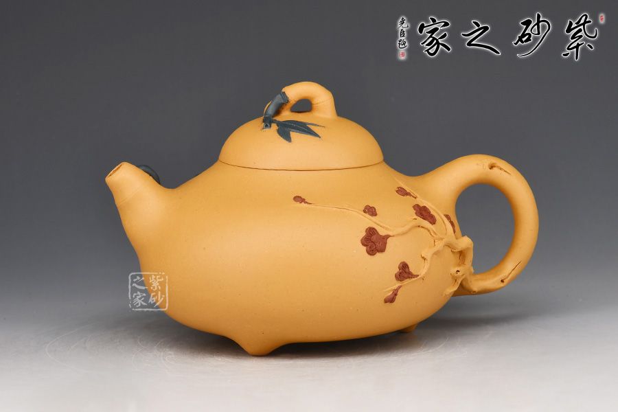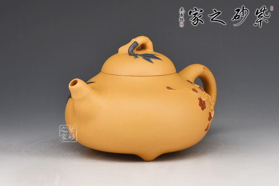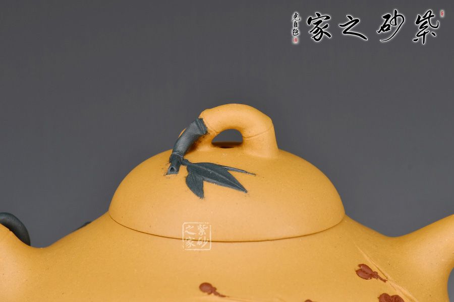 壺身圓潤(rùn)飽滿,外觀豐滿,輪廓?jiǎng)尤耍?xì)膩的感受呼之欲出。底部三足小巧細(xì)致,更顯氣質(zhì)高雅,以竹節(jié)為壺嘴,蔓延裝飾的竹葉隨風(fēng)搖拽,很有動(dòng)感,以竹節(jié)為壺鈕,壺蓋上貼塑竹葉,壺把呈梅樹枝造型,貼塑梅花蔓延于壺身,逼真出神,情趣更動(dòng)人,整器表現(xiàn)出一種大氣之風(fēng)。