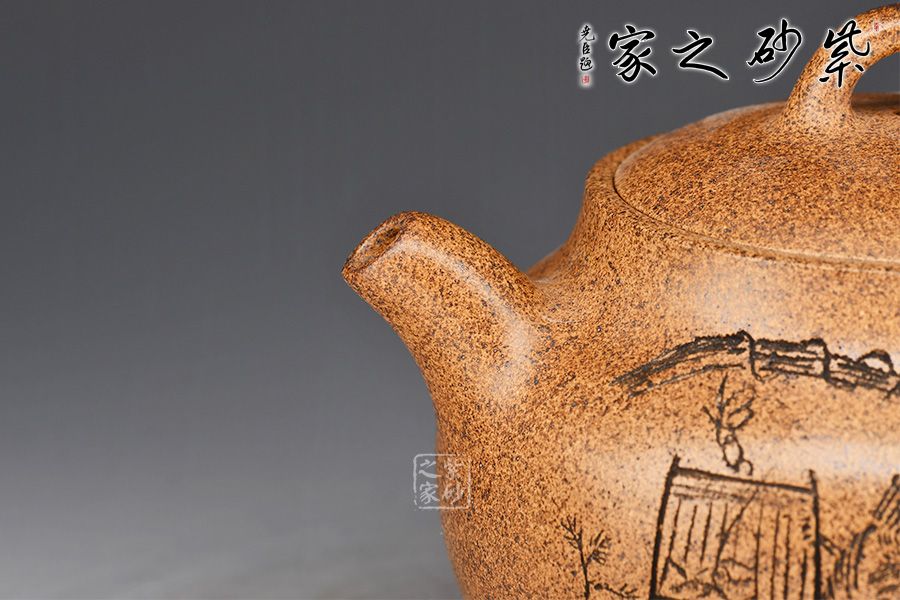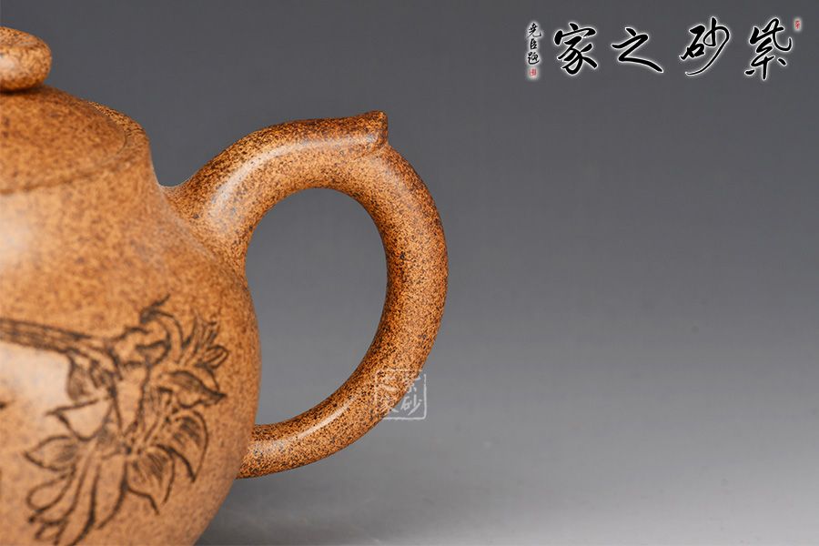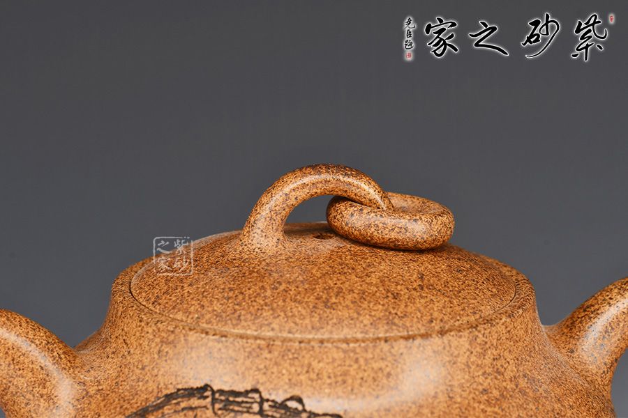 此壺采用原礦黃金砂作胎,老味十足,古意濃厚。壺身圓潤(rùn)飽滿,線條流暢。一彎嘴出水爽利,飛把拿捏舒適。壺蓋配以活環(huán),口與嵌蓋密不透風(fēng)。