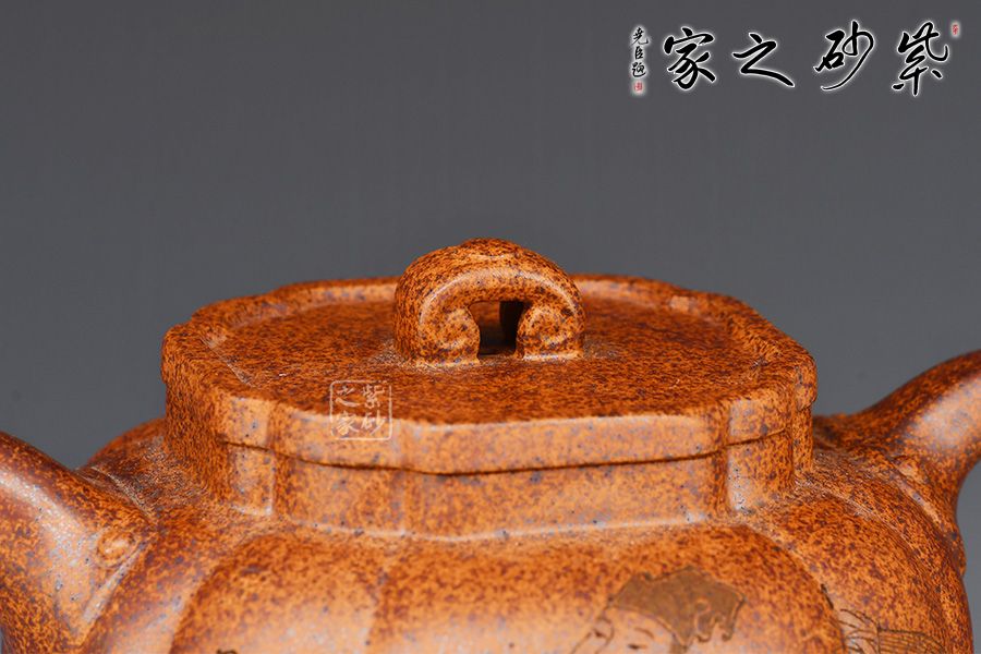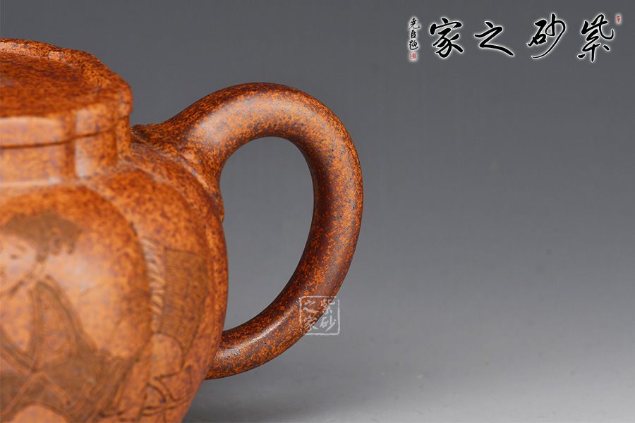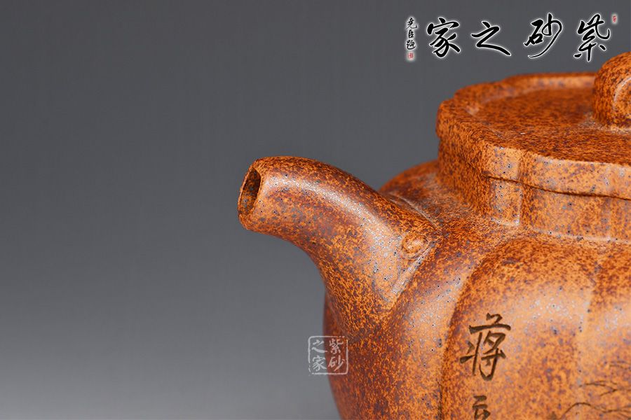 此壺造型兼具方器與筋紋器之美。壺體方圓相融,線條明快,巧妙運用方與圓的轉(zhuǎn)換銜接,加之筋紋線條的勾勒,使壺身達以飽滿而充沛的視覺效果。壺鈕為如意卷裹而成,正上方浮雕塑太極圓盤,呼應(yīng)“太極如意”的主題。壺流一變,胥出自然,與壺肩相接處以如意紋裝飾,壺把承接壺肩壺腹,上下各有如意紋勾勒,流轉(zhuǎn)自然。整器制藝精美,韻味深層,古雅別致,值得入手品賞。