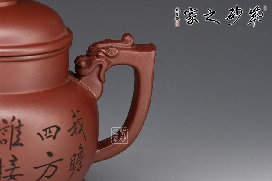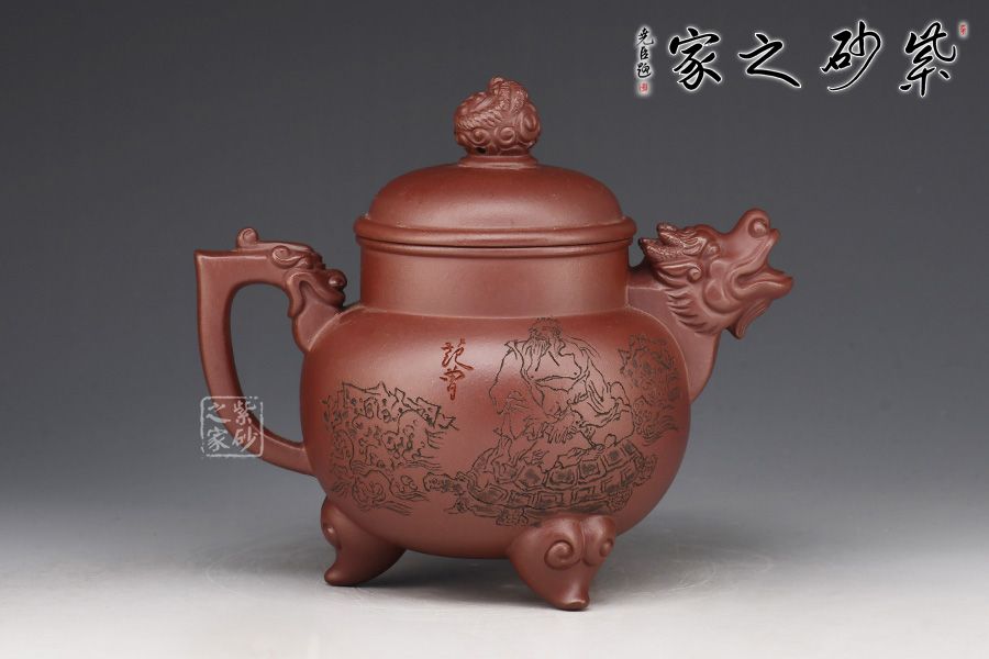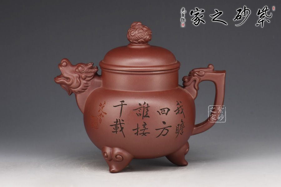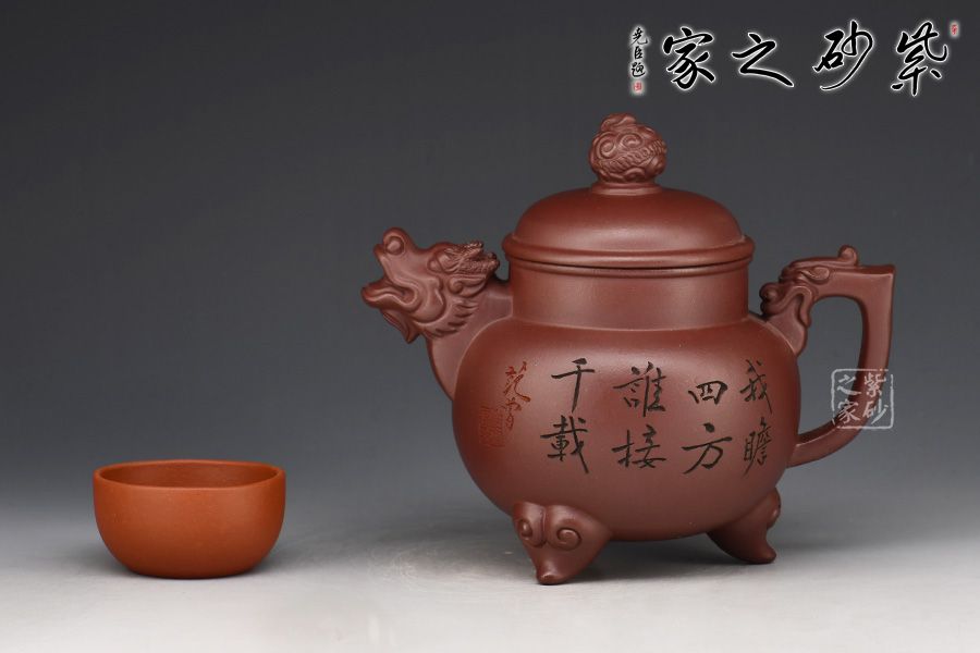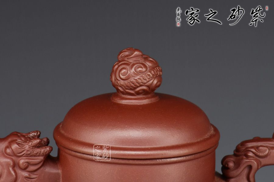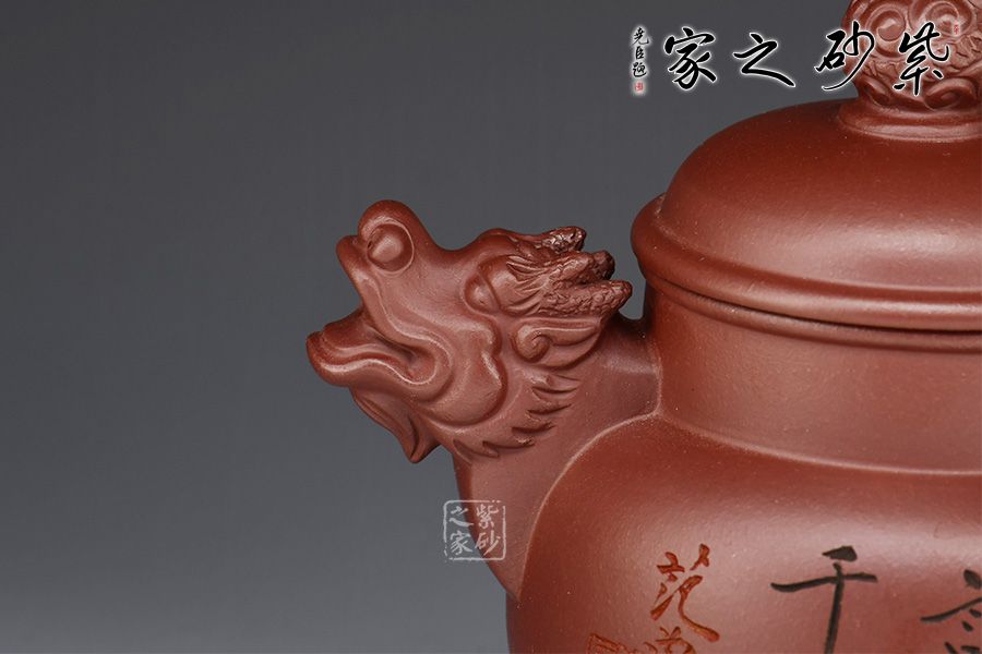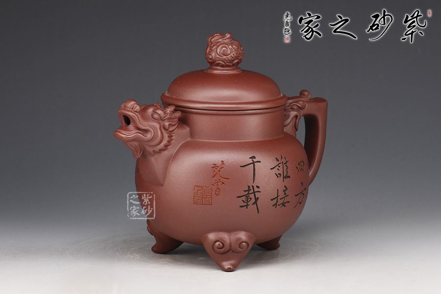 此壺為其選用原礦紫泥,全手工精制而成,泥色溫潤雅致。壺身飽滿圓潤,線條流暢,高頸,壓蓋,龍珠鈕。壺嘴鑲嵌龍頭,出水流暢,壺把有龍頭環(huán)繞,壺柄敦厚,端握適手,三足鼎立,平添幾分巧趣。