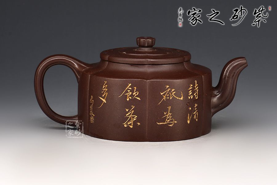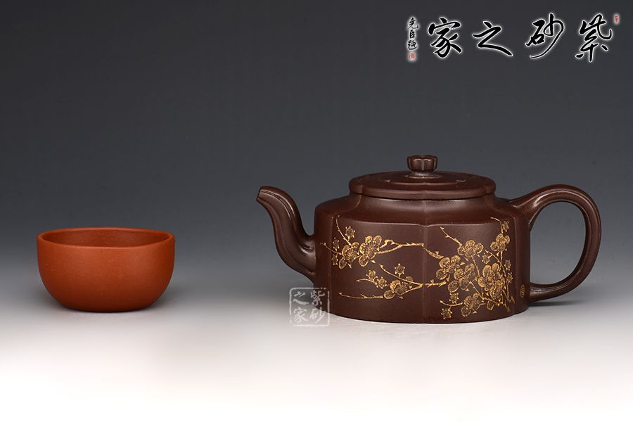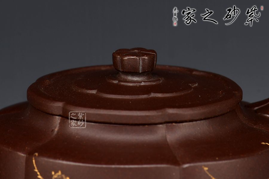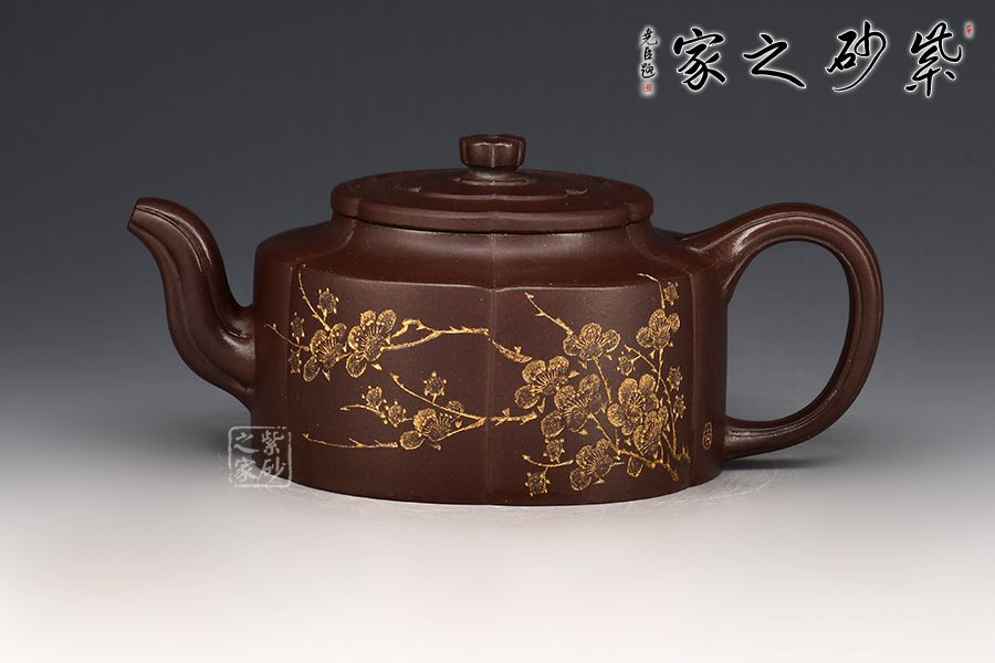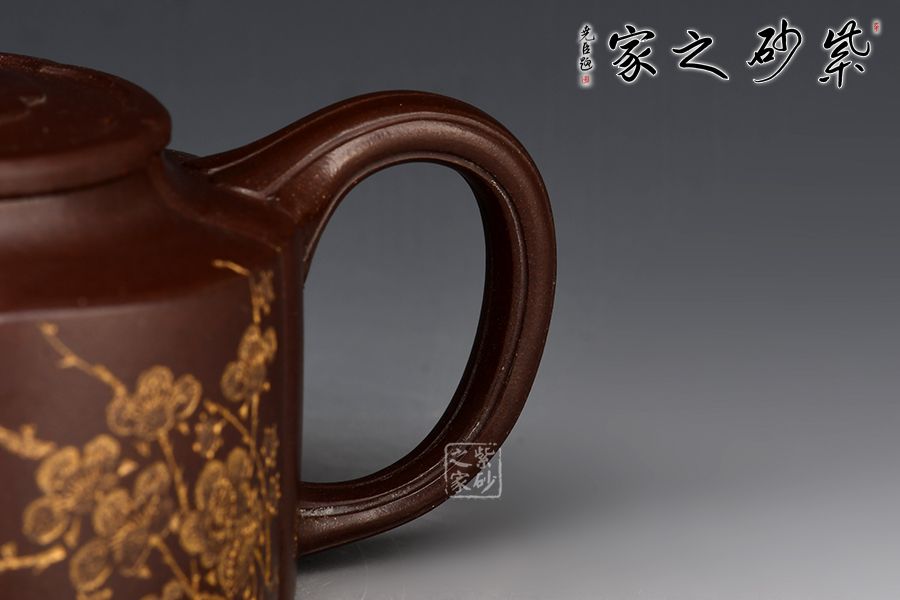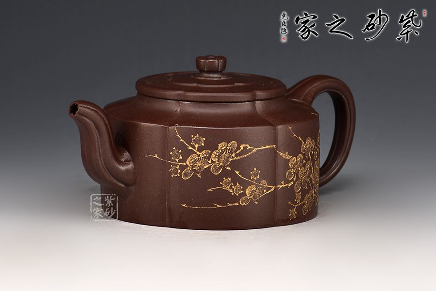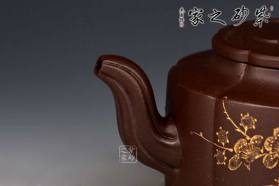 梅花周盤壺采用紫玉金砂手工制成,泥色古樸,形制典雅。此壺為經(jīng)典造型,壺身圓潤而不失剛勁,經(jīng)得起長久的玩味與審視。 由蓋鈕到壺身,均分為六瓣梅花式,筋紋工整而勻稱,轉折線角清晰明確,氣韻貫通,流、把上的陰線流利明快,形成橫向銜接,與壺身的直向性相對應,寓變化之妙于其中。三彎流,圓潤把手,彎曲成方耳,與圓桶壺身鑲接自然。 壺蓋修飾為六瓣梅花形,蓋上陰陽線條修飾,由上俯視,蓋的似蕊,蓋面蓋圈、壺肩皆為盛放的梅花朵朵,讓人感嘆通壺制作的工精藝謹。