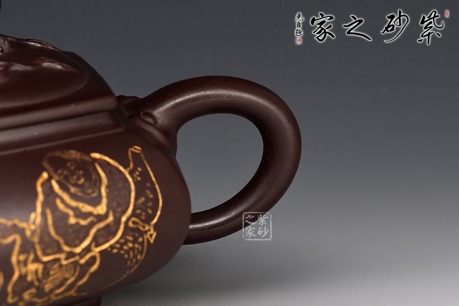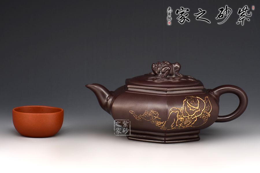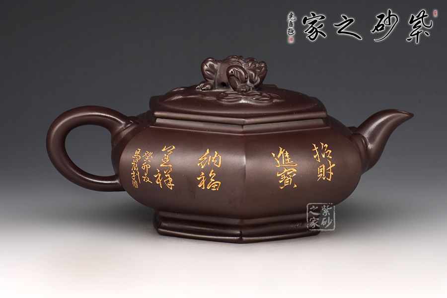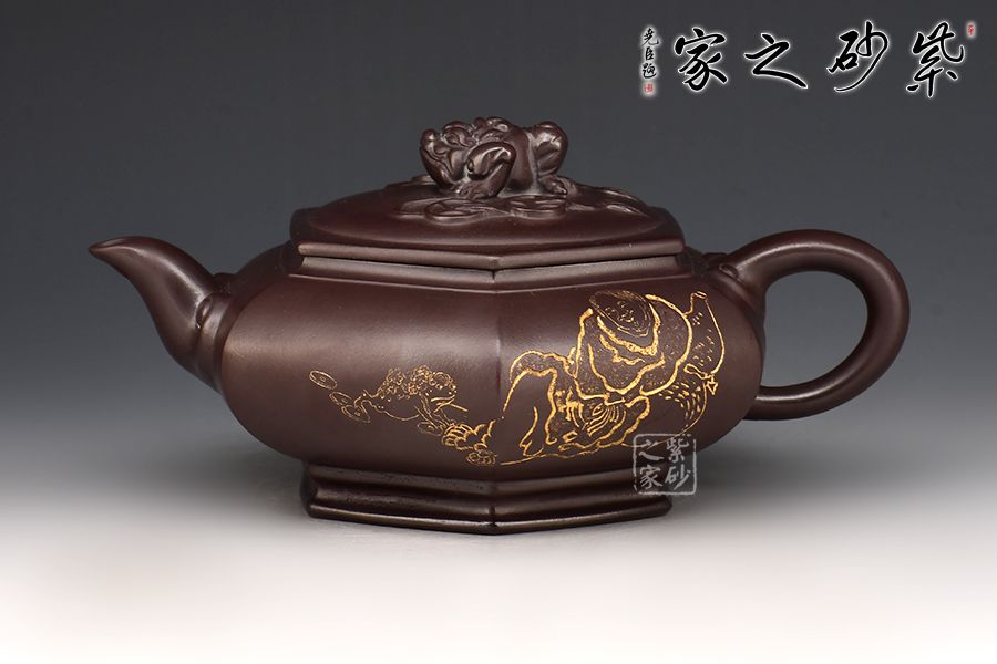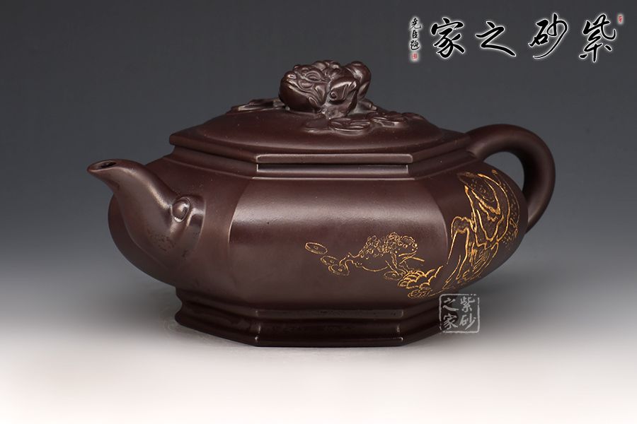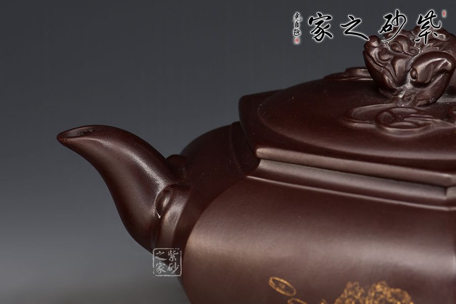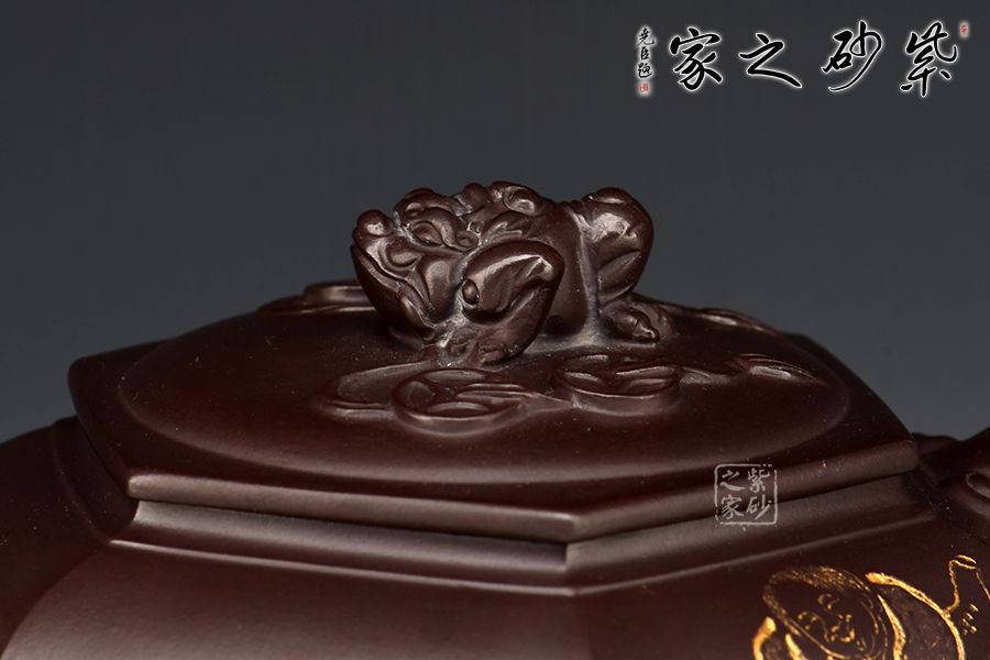 整壺精選紫玉金砂,老師全手工精制而成,泥色古樸,泡茶利器。壺身六方,壺腹飽滿,嘴把明接壺身,一彎嘴出水爽利,耳把拿捏舒適。壓蓋設計,嚴絲合縫,壺鈕為開運金蟾,招財進寶。