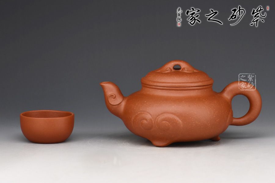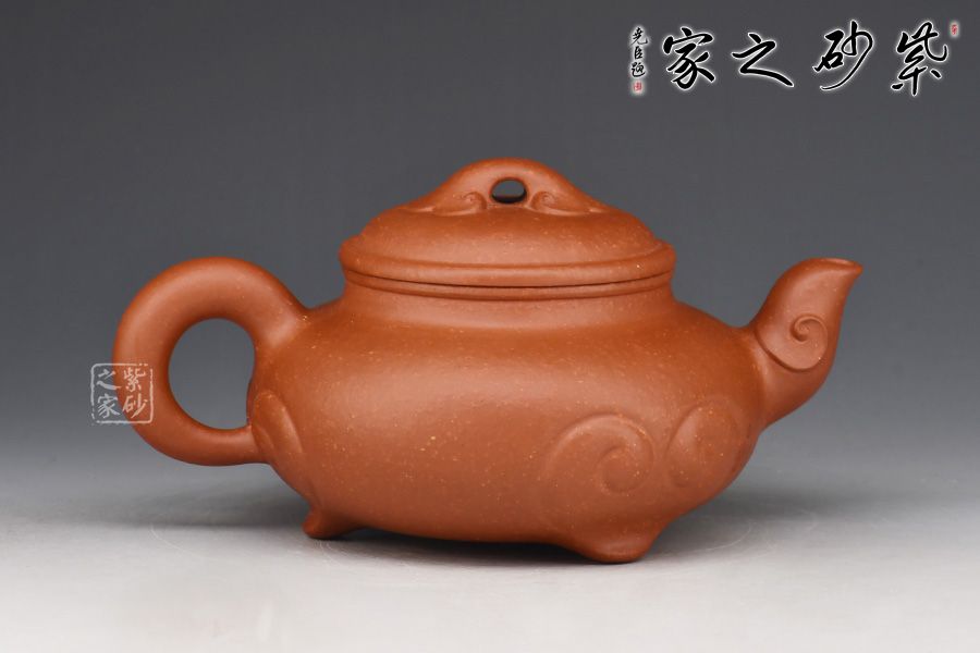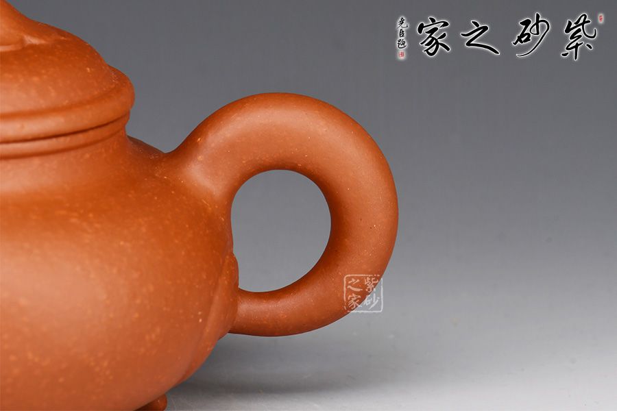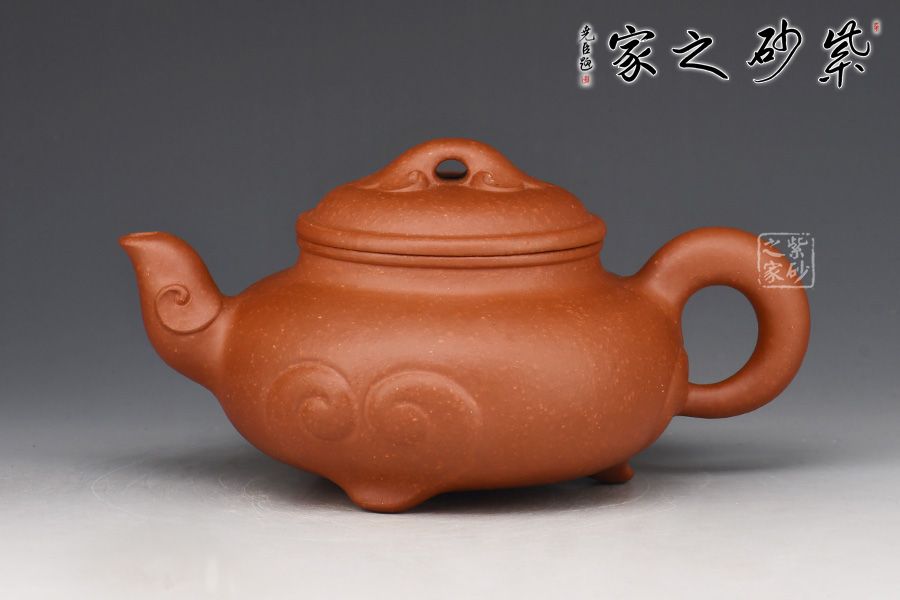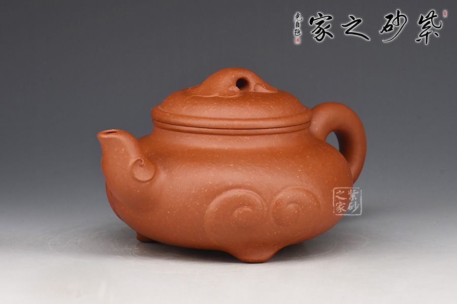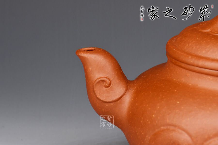 壺身為圓形,但腹部壓扁,顯得圓滑可愛,身上如意造型裝飾,圓滑中便有沉穩(wěn)之意。二彎嘴出水爽利,出水爽利,如意紋與壺身相對應(yīng),呼應(yīng)壺意,耳把粗細(xì)有致,拿捏舒適。