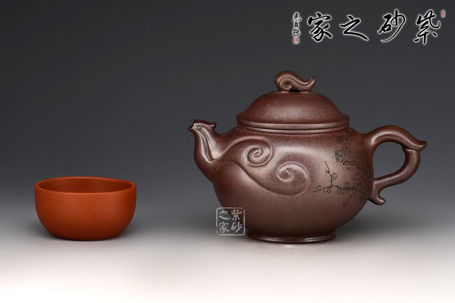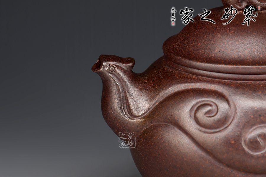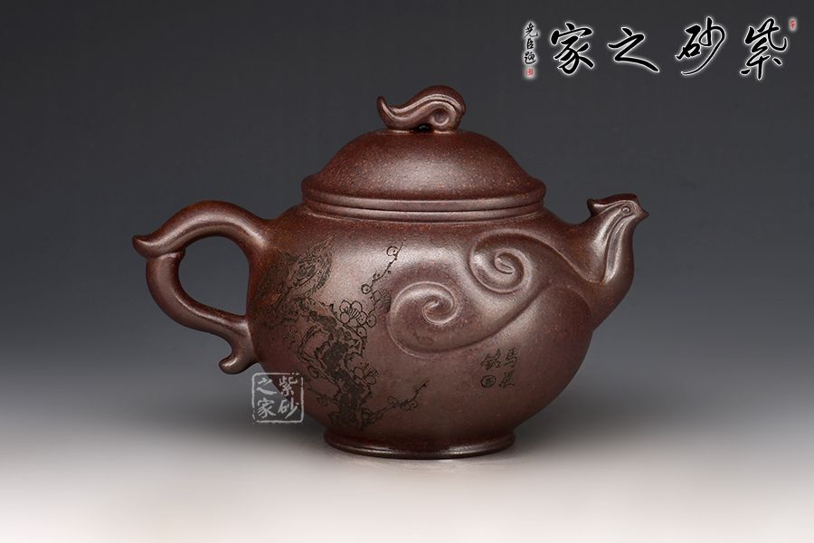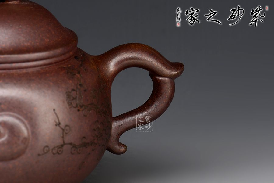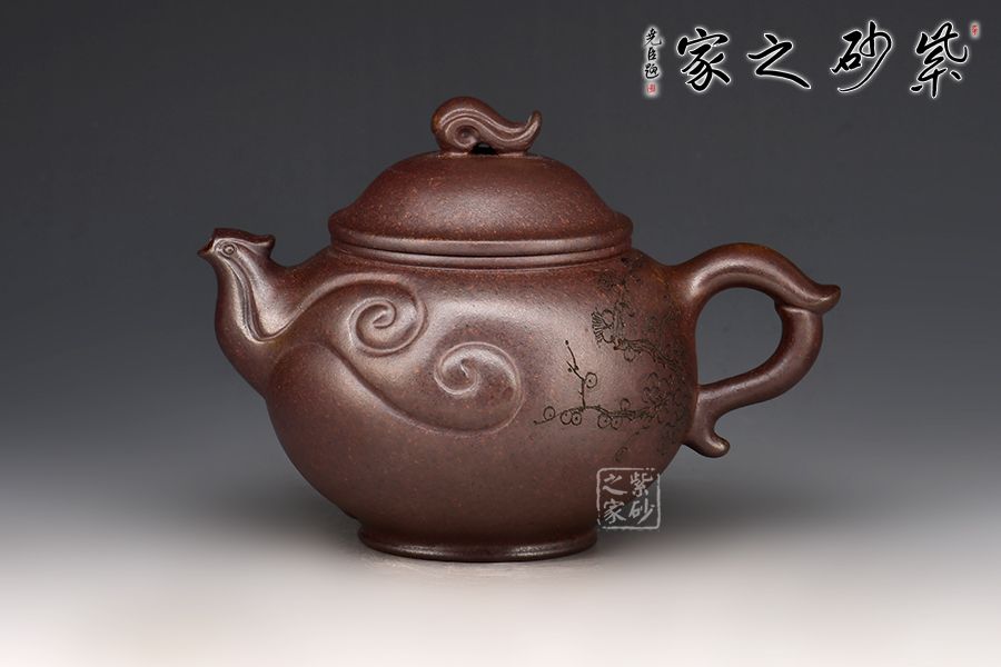 此云爐壺赤龍煥彩為胎,色潤(rùn)質(zhì)堅(jiān),壺腹圓滑飽滿(mǎn),整壺造型簡(jiǎn)練有致。壓蓋設(shè)計(jì)嚴(yán)絲合縫,壺蓋微鼓,如意壺鈕,寓意吉祥。壺嘴、壺把設(shè)計(jì)獨(dú)特,壺嘴為雞首,壺柄為雞尾。此外,壺身刻繪梅枝,梅姿百態(tài),或正,或仰,或俯,或半開(kāi),或盛開(kāi),或含苞。整壺精工手作,賞藏兼?zhèn)洹?/p>