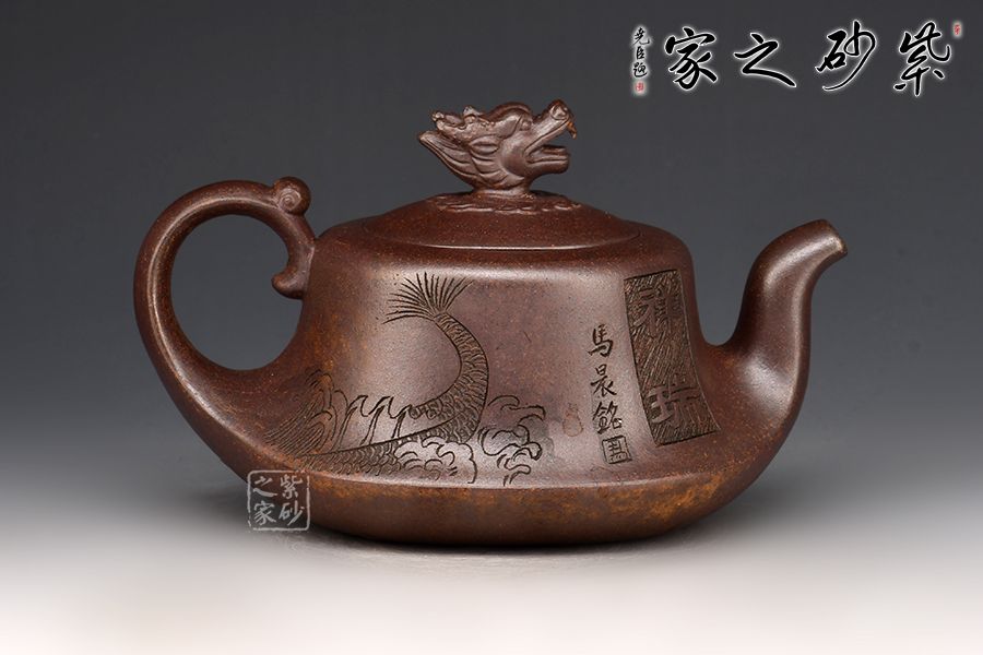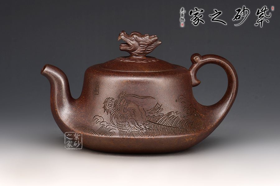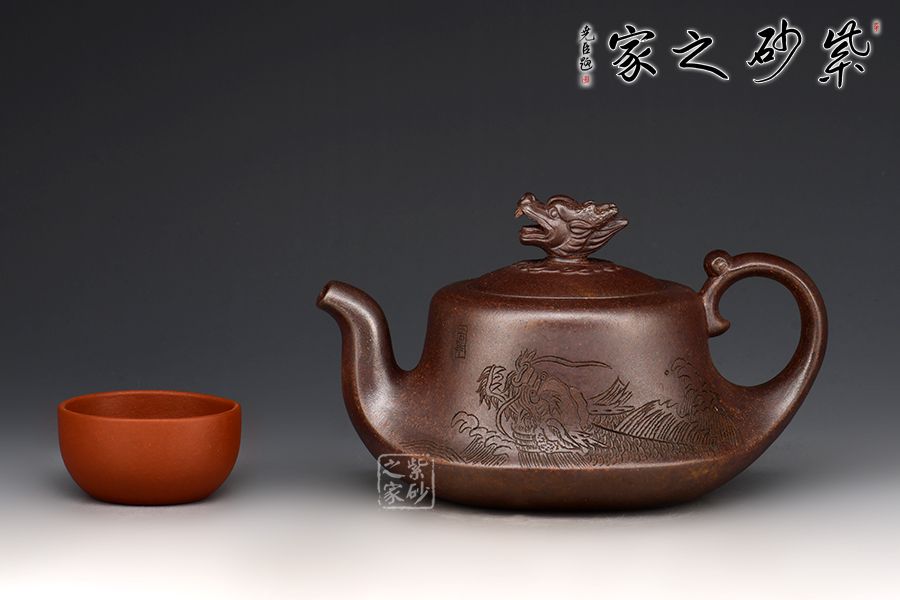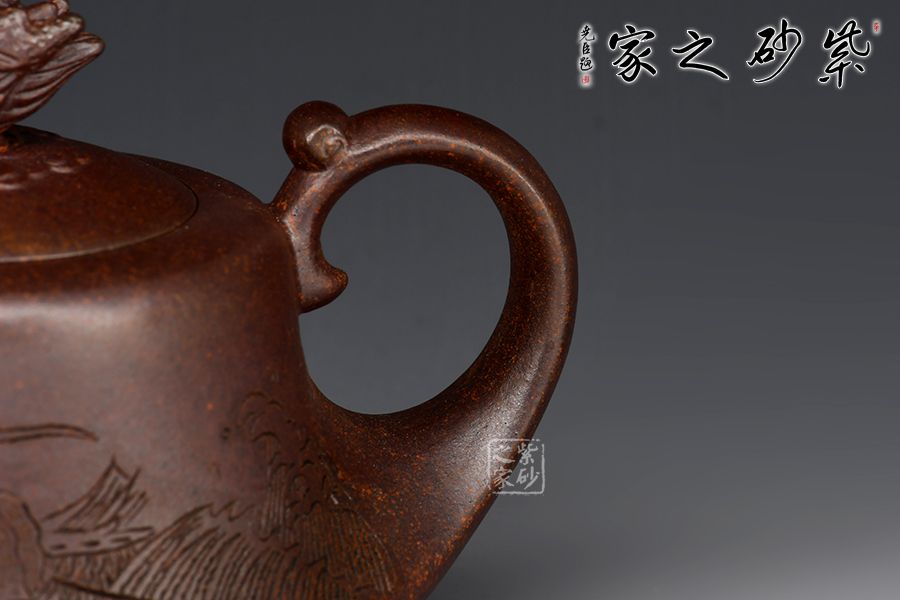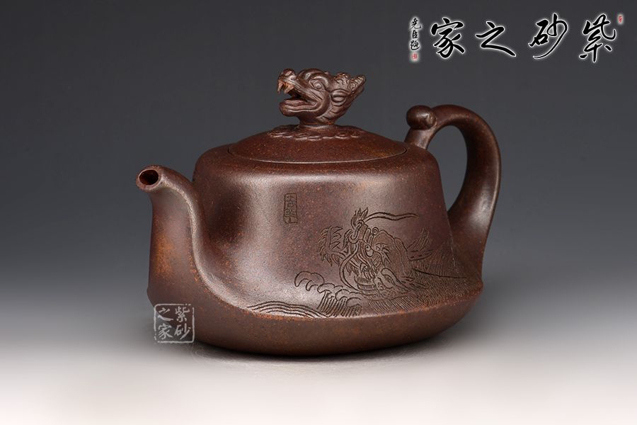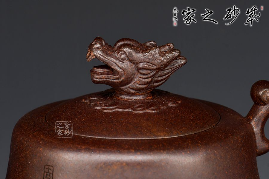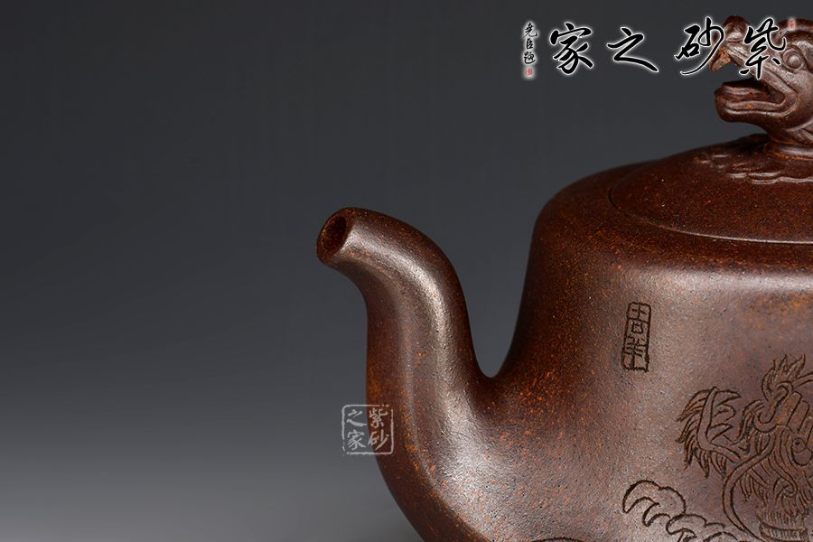 赤龍煥彩,采用家藏大紅袍朱泥底料結(jié)合極其珍貴黃金段料研磨成顆粒,請教原紫砂廠練泥車間老師傅,進行多次配比實驗,燒成后黃金段顆粒自然排列有如龍之金鱗,融合的大紅袍朱泥特性,故名赤龍煥彩。