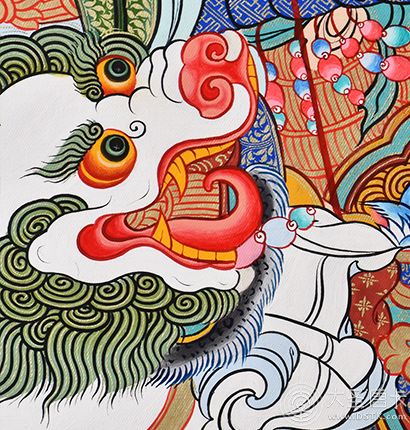 在繪制佛像服飾等位置時,用刻金技法,使圖案更具豐富的層次和立體感,用金勾勒的線條和圖案不但明亮度進一步提高,讓畫面更加燦爛,而且也使金在畫面上保持得更加長久。