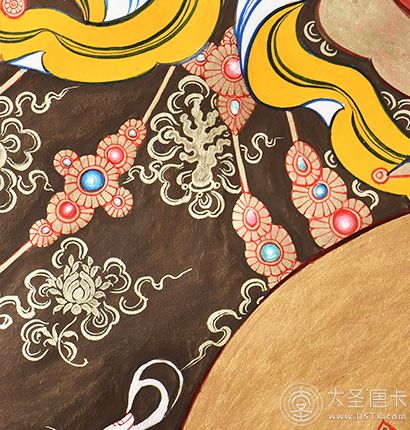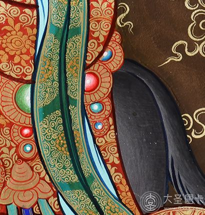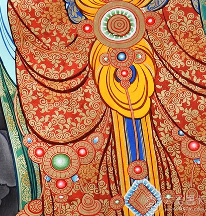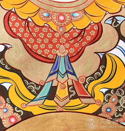 在繪制佛像服飾等位置時,用刻金技法,使圖案更具豐富的層次和立體感,用金勾勒的線條和圖案不但明亮度進一步提高,讓畫面更加燦爛,而且也使金在畫面上保持得更加長久。