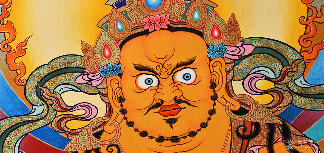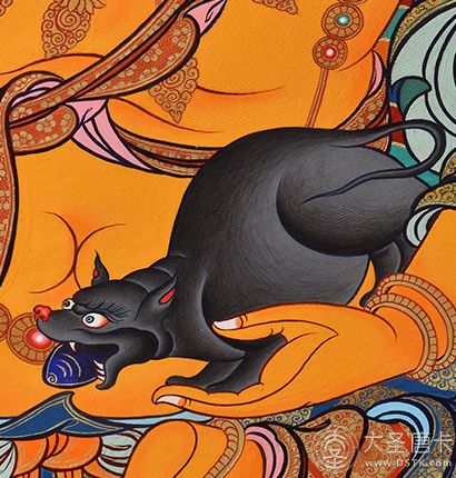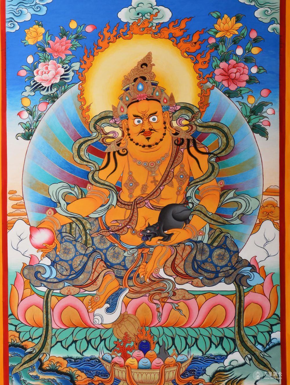 黃財神,是密教之護法神祇,諸財神之首,黃財神為藏地各大教派奉持的五色財神之一,右手持摩尼寶,象征寶光普照十方,增添眾生的福報;左手抱一只吐寶鼠,鼬的嘴里含著珠寶,象征財寶。右腳踏一只白色海螺,象征著他能入海取寶。