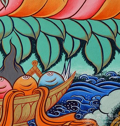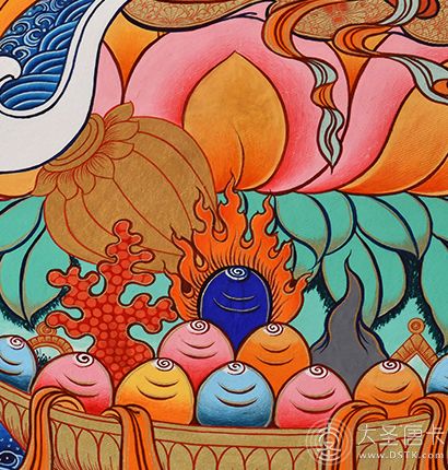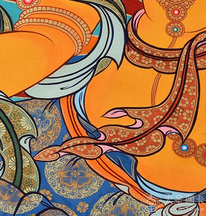 該作品在表現(xiàn)形式及構(gòu)圖和設(shè)色上吸收了漢地工筆畫的畫風(fēng),與藏傳繪畫藝術(shù)兼容并蓄,在傳統(tǒng)上加進自己對繪畫和佛教的理解來創(chuàng)作,意境遼遠。線條的繪制手法精湛,細致而不纖弱,流暢舒緩。