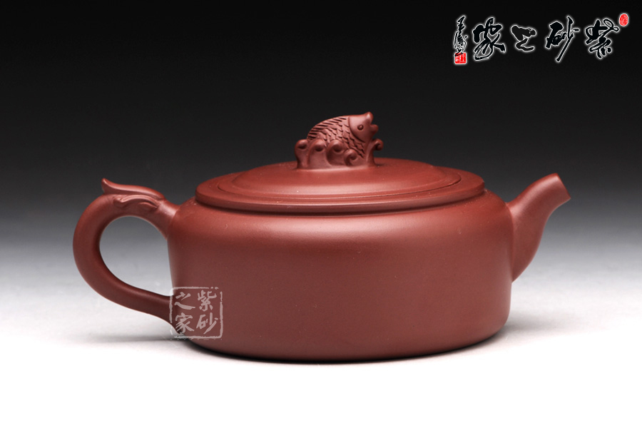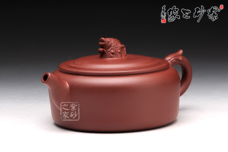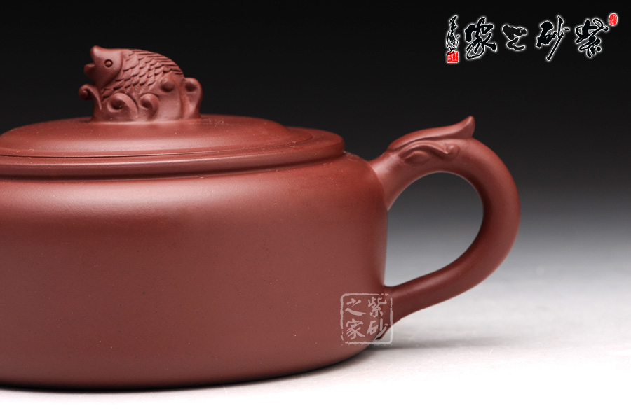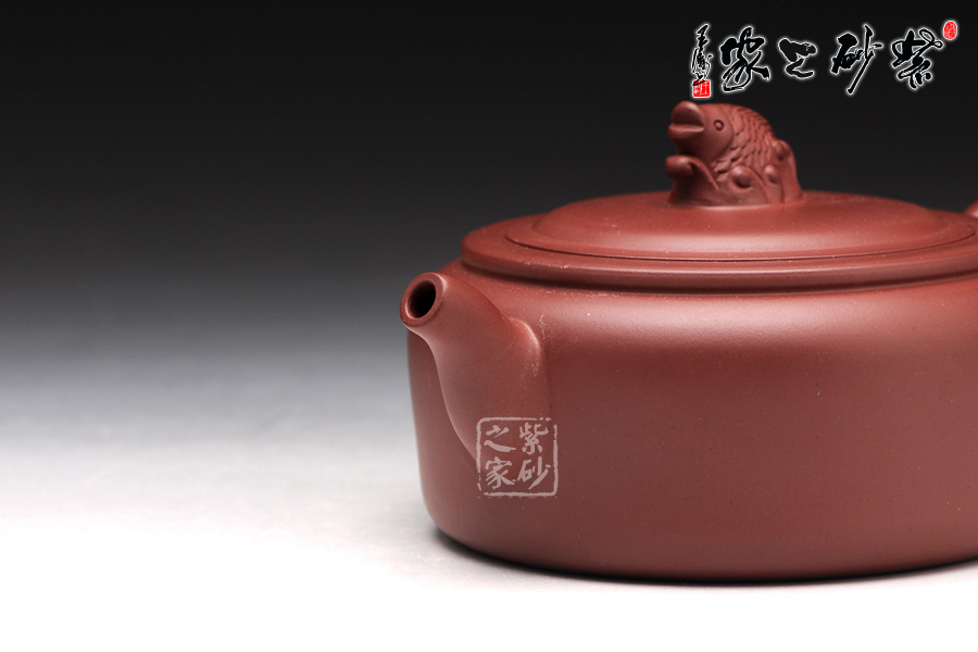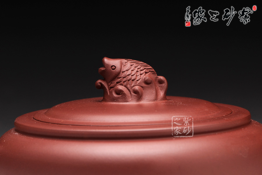 高升壺作為紫砂圓形光器,制作起來很能顯示工藝技巧和嫻熟程度,并且從藝術(shù)底蘊中流溢文化趣味;原礦紅泥紫中含朱的色澤,豐腴滋潤的壺體,道法自然,妙化心造;壺身為扁柱形,簡約大氣,壺口碩大,平蓋廣闊,壺鈕設(shè)計為“鯉魚躍龍門”,涌起的水浪簇擁著鯉魚躍起,十分形象逼真;壺把為盤龍之形,輪廓飄逸,持握舒適;嘴型精巧,略富壺基,嘴口圓潤平和,出水爽利。