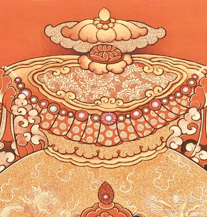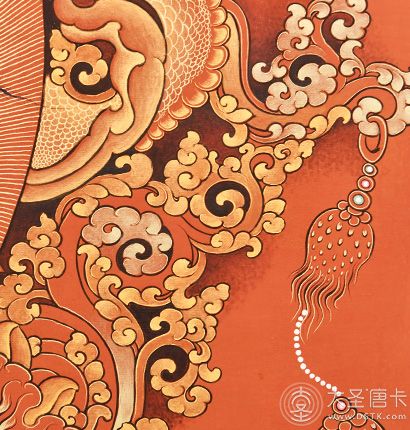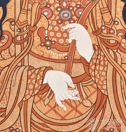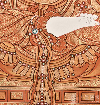 在繪制佛像服飾等位置時(shí),用刻金技法,使圖案更具豐富的層次和立體感,用金勾勒的線條和圖案不但明亮度進(jìn)一步提高,讓畫面更加燦爛,而且也使金在畫面上保持得更加長久。