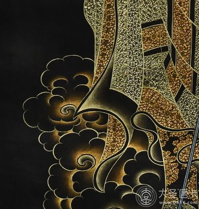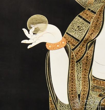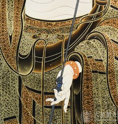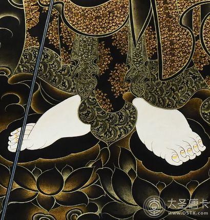 在繪制佛像服飾等位置時,用刻金技法,使圖案更具豐富的層次和立體感,用金勾勒的線條和圖案不但明亮度進(jìn)一步提高,讓畫面更加燦爛,而且也使金在畫面上保持得更加長久。