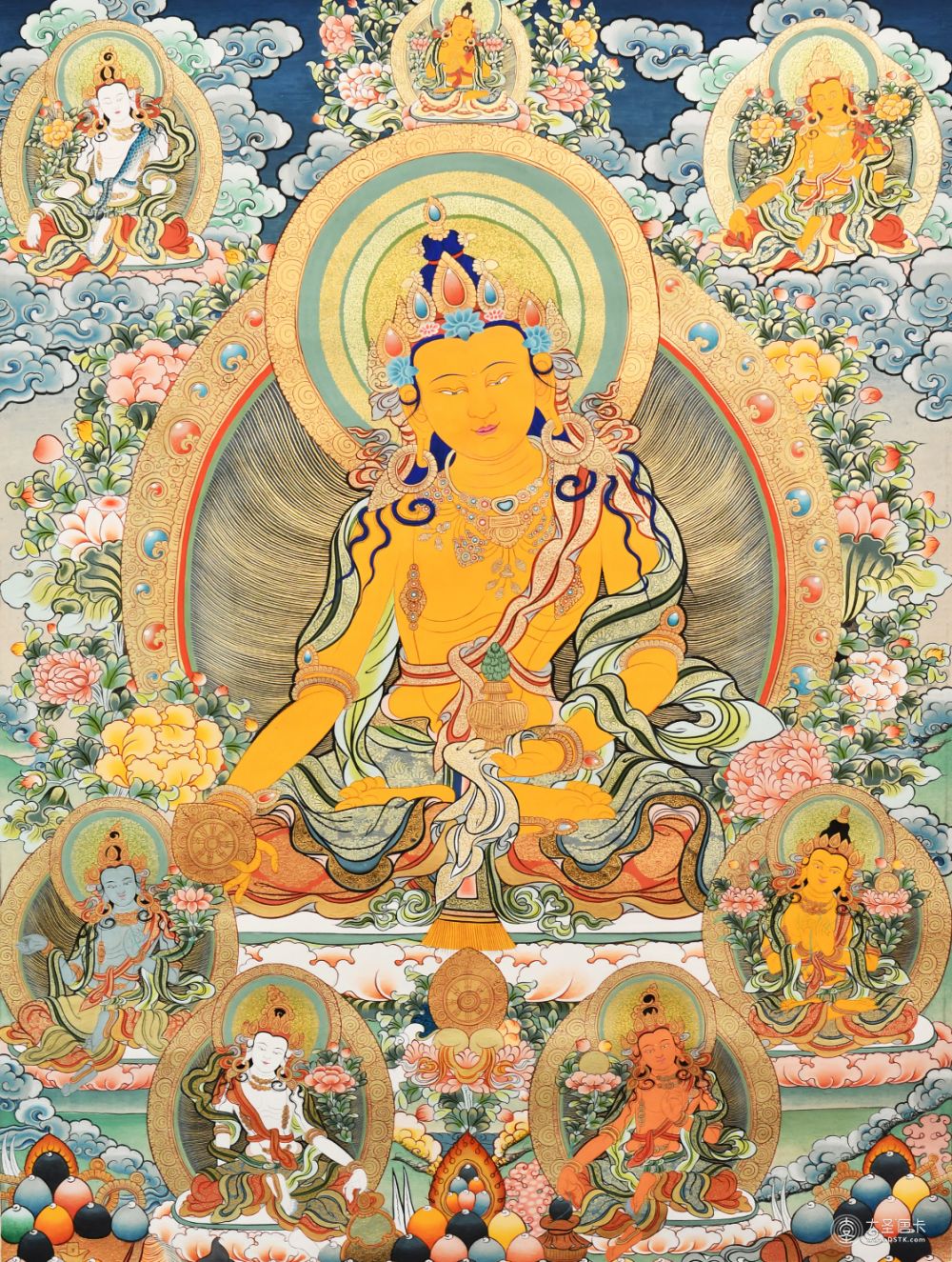 | 唐卡是歷史的瑰寶,現已被例入國家非物質文化遺產名錄,得到了高度的重視和保護。同時由于顏料的珍稀、繪制周期長、工藝復雜大大增強了其珍藏價值。一幅好的作品可遇不可求,近年來唐卡已成為收藏界炙手可熱的藏品。 | 唐卡的形式便于攜帶,其內容體現了藏傳佛教的莊重、神圣、華貴,被稱為“移動的佛像”。同時也是修行者積累善業(yè),追尋心靈的平靜與安寧的一個過程。 | 唐卡的內容包羅萬象,它以圖像的方式承載著藏族文化精髓,是藏族智慧的結晶,廣泛傳播了藏地的文化、歷史和宗教理論。 | 唐卡絢麗的色彩、流暢的線條、嚴謹的結構,都充滿著濃郁的高原和游牧民族風情,無疑是難得的藝術珍品。值得一提的是唐卡繪制顏料全部為天然礦物顏料,畫面效果艷麗,可以保存千年而不變色。 |