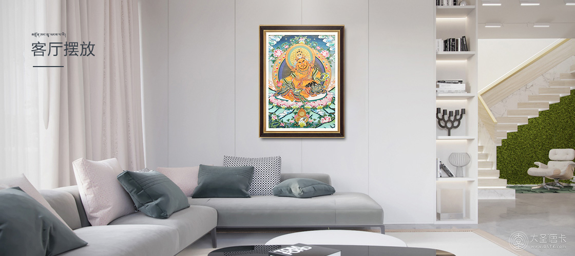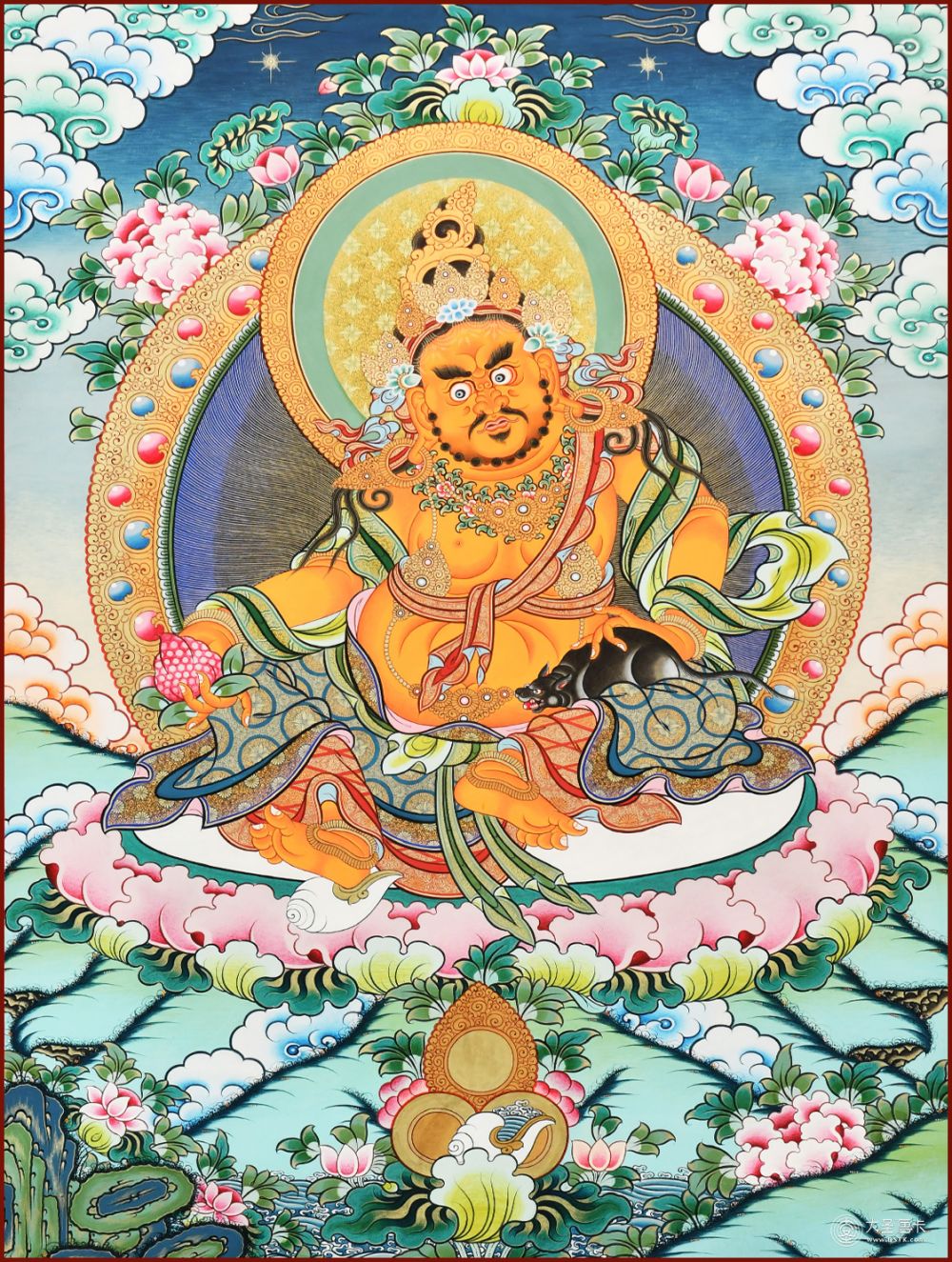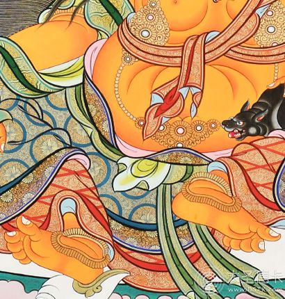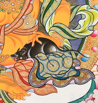 黃財(cái)神,是密教之護(hù)法神祇,諸財(cái)神之首,黃財(cái)神為藏地各大教派奉持的五色財(cái)神之一,右手持摩尼寶,象征寶光普照十方,增添眾生的福報(bào);左手抱一只吐寶鼠,鼬的嘴里含著珠寶,象征財(cái)寶。右腳踏一只白色海螺,象征著他能入海取寶。