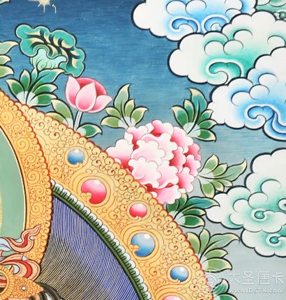 在繪制佛像服飾等位置時(shí),用刻金技法,使圖案更具豐富的層次和立體感,用金勾勒的線條和圖案不但明亮度進(jìn)一步提高,讓畫面更加燦爛,而且也使金在畫面上保持得更加長久。
