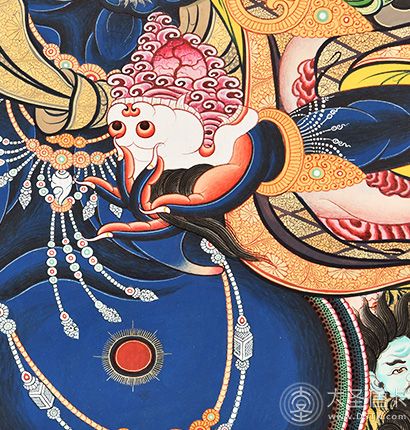 在繪制佛像服飾等位置時(shí),用刻金技法,使圖案更具豐富的層次和立體感,用金勾勒的線條和圖案不但明亮度進(jìn)一步提高,讓畫面更加燦爛,而且也使金在畫面上保持得更加長久。