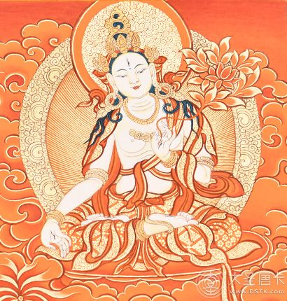 【綠度母的法相】綠度母造像為菩薩裝,全身呈翠綠色,是藏傳佛教的事業(yè)部之色,亦即不空成就佛之身色。一面二臂,面容姣好,二八妙齡,身材纖細(xì),美貌絕倫。頭戴小五佛寶冠,身子放射出虹光,身佩各種瓔珞珠寶,著各色天衣,下身重裙,其形象華貴美麗,慈祥莊嚴(yán)。