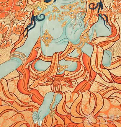 在繪制佛像服飾等位置時(shí),用刻金技法,使圖案更具豐富的層次和立體感,用金勾勒的線條和圖案不但明亮度進(jìn)一步提高,讓畫面更加燦爛,而且也使金在畫面上保持得更加長久。