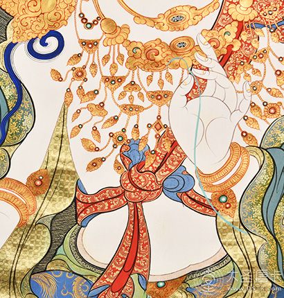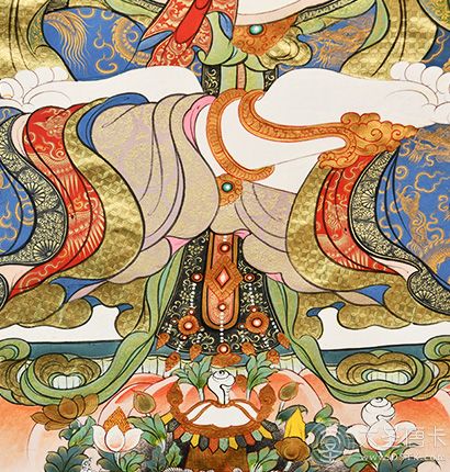 在繪制佛像服飾等位置時(shí),用刻金技法,使圖案更具豐富的層次和立體感,用金勾勒的線條和圖案不但明亮度進(jìn)一步提高,讓畫面更加燦爛,而且也使金在畫面上保持得更加長(zhǎng)久。