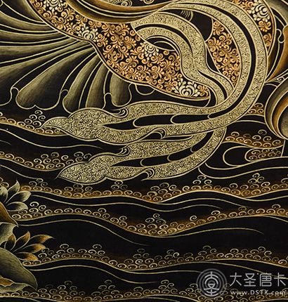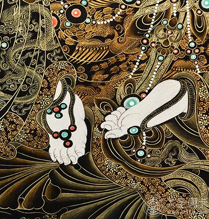 在繪制佛像服飾等位置時(shí),用刻金技法,使圖案更具豐富的層次和立體感,用金勾勒的線條和圖案不但明亮度進(jìn)一步提高,讓畫面更加燦爛,而且也使金在畫面上保持得更加長(zhǎng)久。