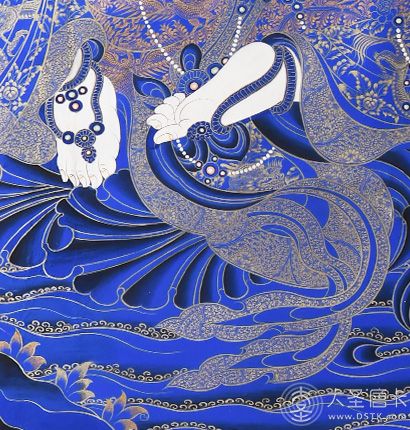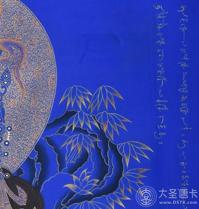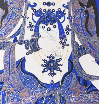 該作品在表現(xiàn)形式及構圖和設色上吸收了漢地工筆畫的畫風,與藏傳繪畫藝術兼容并蓄,在傳統(tǒng)上加進自己對繪畫和佛教的理解來創(chuàng)作,意境遼遠。線條的繪制手法精湛,細致而不纖弱,流暢舒緩。