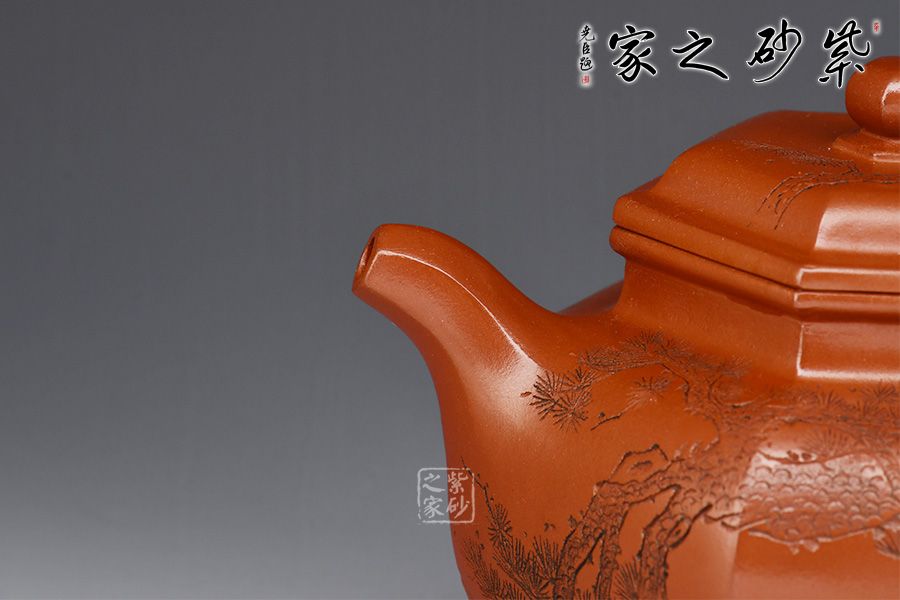 朱泥含鐵量多寡不等,燒成之后變朱砂、朱砂紫或海棠紅等色,熱水沖淋立展嬌嫩鮮紅特色,壺身游移紫光顯現(xiàn),神秘迷人風韻令愛壺之人神醉;有些朱泥含鐵很高,燒成溫度稍高,就會有鐵質(zhì)析出,出現(xiàn)鐵熔點,這樣的泥料顯得格外富有質(zhì)感。