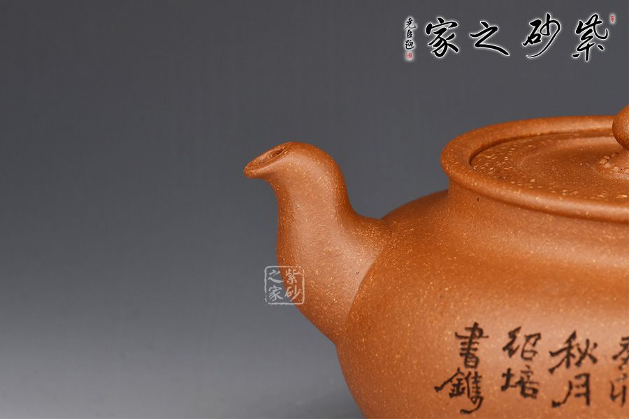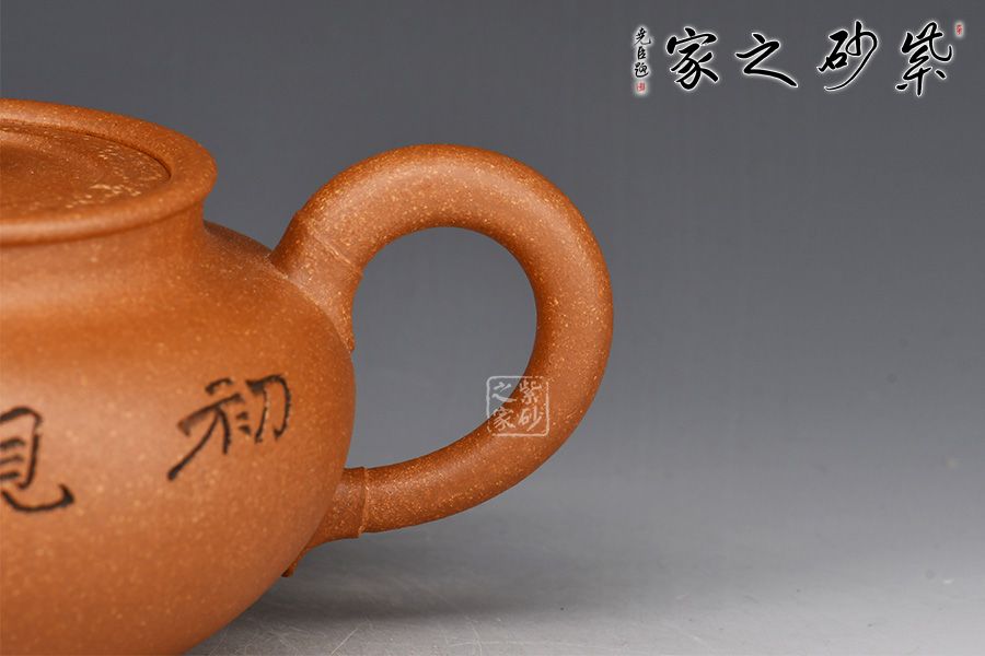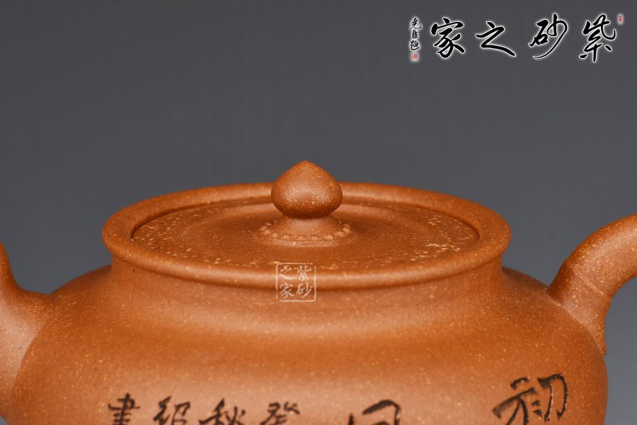 壺滴運用鼓子工藝,如水滴將入江河。壺蓋采用鋪砂工藝,桂花砂星星點點、疏密有致,渾然天成。蓋面設計獨出心裁,似水波紋,漾起漣漪,與壺身陶刻相呼應。初見壺整體采用降坡泥摶制,質感細膩豐富,色澤明亮溫暖,盡顯彌足珍貴。