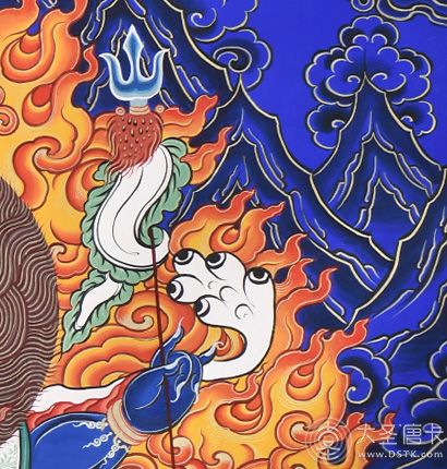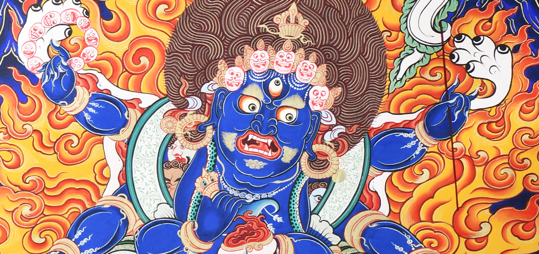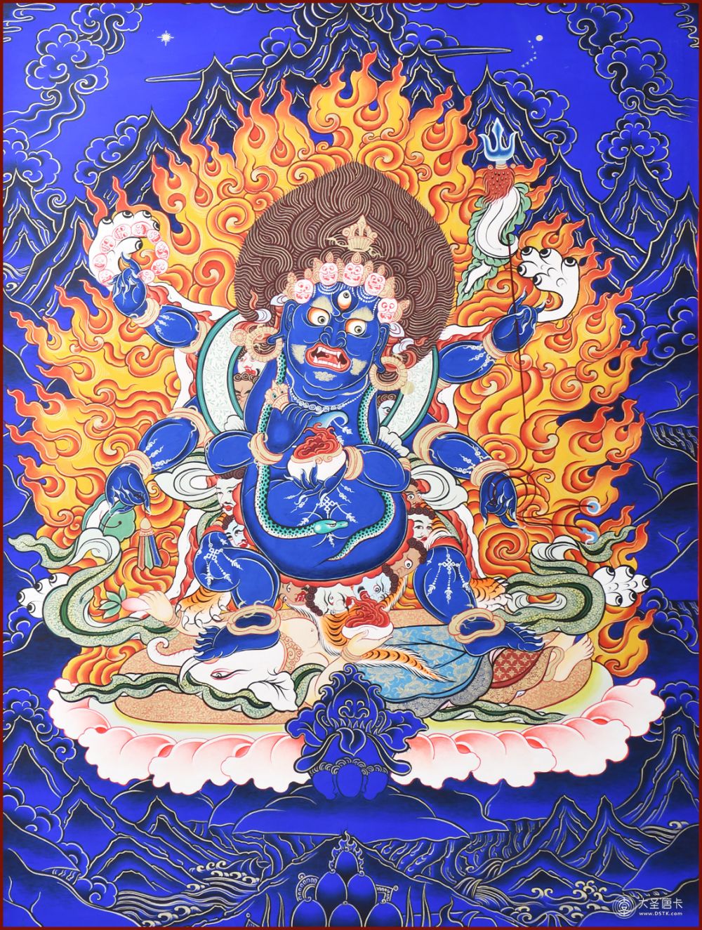 瑪哈嘎拉是梵語,意思是"大黑",即"怙主"之意?,敼吕欠鸾倘镜幕?。其為調(diào)伏剛強(qiáng)眾生而呈現(xiàn)忿怒相,本尊及眷屬護(hù)法眾除護(hù)持佛法外,依緣起多示現(xiàn)為兩臂、四臂、六臂黑,白等形象,為藏傳佛教諸宗共同推崇的智慧護(hù)法。