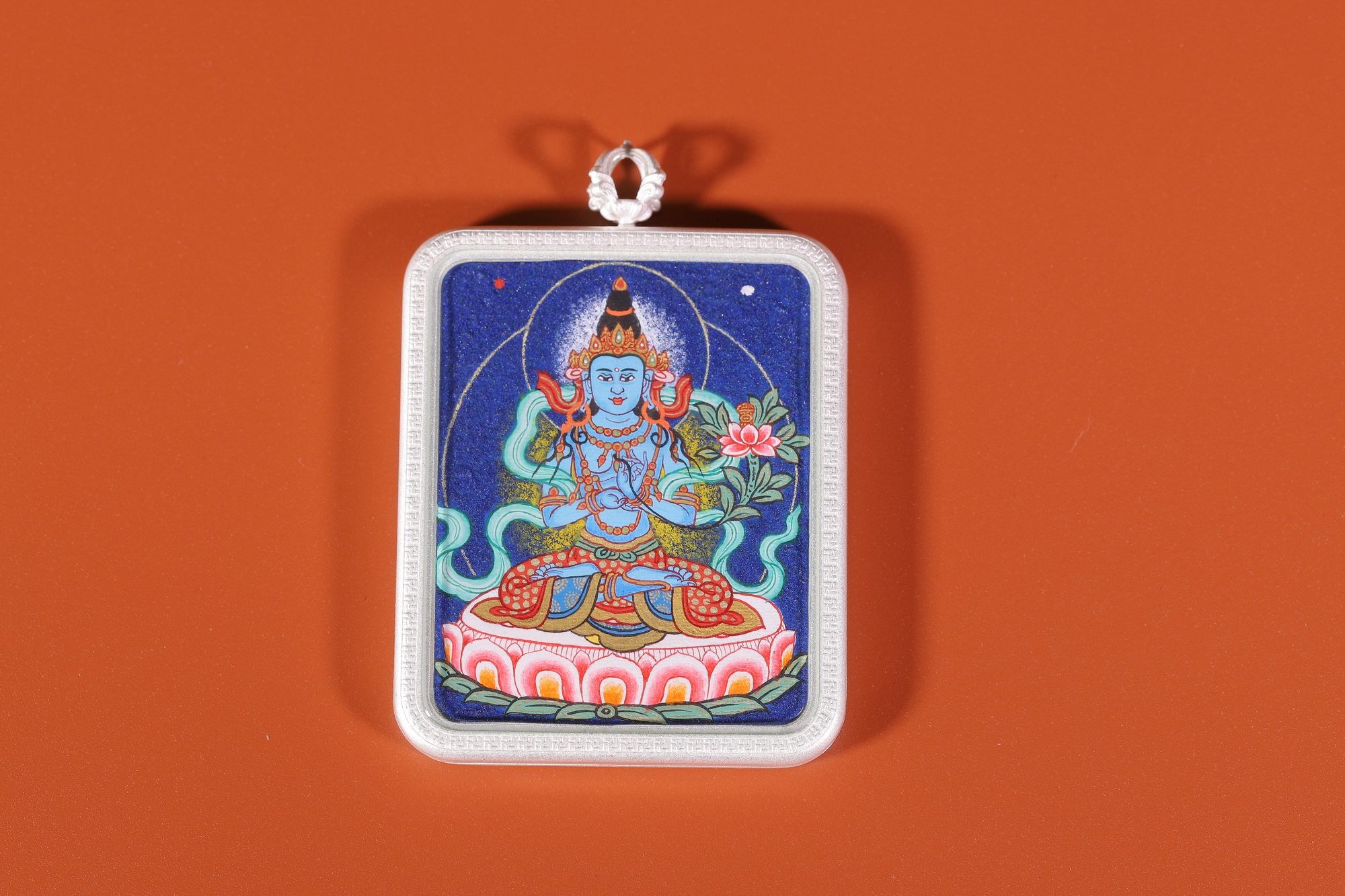 產(chǎn)地:熱貢 工藝: 創(chuàng)作年份:2023 題材:大勢(shì)至菩薩 繪制時(shí)間:15日 尺寸:4*5cm 裝裱:鏡片 材質(zhì):藏綿布 使用場(chǎng)地:隨身佩戴