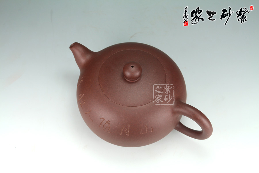 圓燈壺是傳統(tǒng)器型,以傳統(tǒng)為基準制作,與老師設計的《十二生肖系列壺》有異曲同工之妙。壺身為經典的圓器造型,配以傳統(tǒng)的圈把與彎流,無一不是在向傳統(tǒng)致敬;加底設計使得整器更有立體感;一粒珠似的壺鈕設計與整體搭配協(xié)調一致。壺身由凌錫茍親自篆刻“山月隨人歸”一句,此句出自李白的《下終南山過斛斯山人宿置酒》,體現(xiàn)了作品真情實感的流溢!