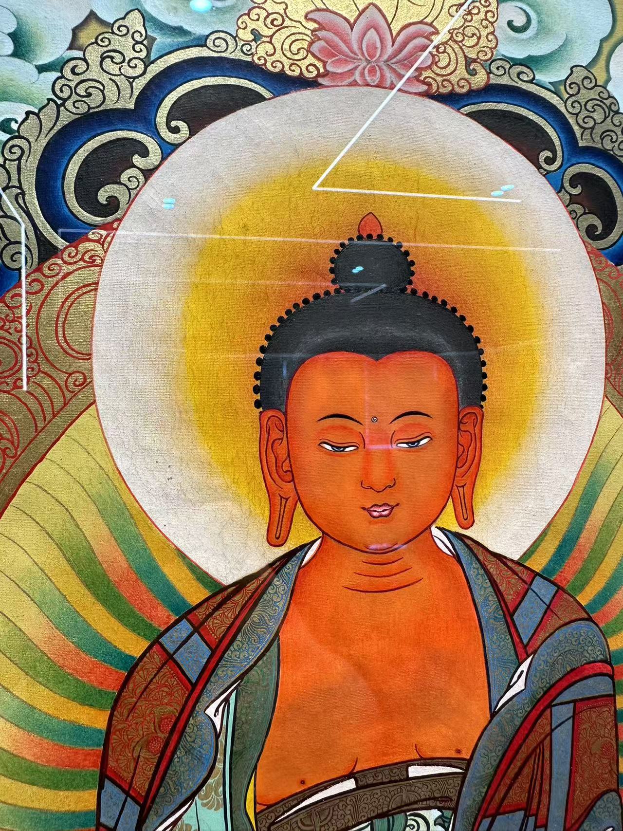 | 唐卡“師傅”開臉,筆路穩(wěn)重流暢。體現(xiàn)完美天人相,可見佛菩薩慈眉善目,賦予唐卡畫像生的靈氣。 | 細節(jié)決定品質(zhì),點睛之筆不到位影響整體美觀,五官比例不協(xié)調(diào),面目呆板,缺乏靈氣。 |