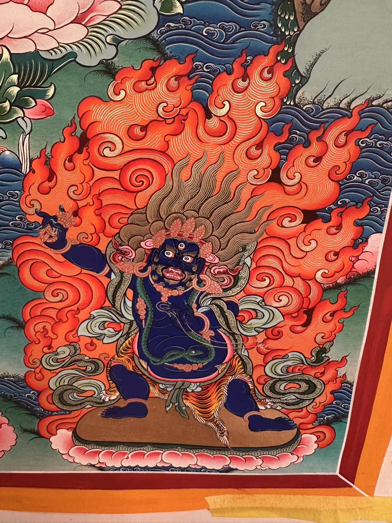 | 唐卡是歷史的瑰寶,現(xiàn)已被例入國家非物質(zhì)文化遺產(chǎn)名錄,得到了高度的重視和保護(hù)。同時由于顏料的珍稀、繪制周期長、工藝復(fù)雜大大增強(qiáng)了其珍藏價值。一幅好的作品可遇不可求,近年來唐卡已成為收藏界炙手可熱的藏品。 | 唐卡的形式便于攜帶,其內(nèi)容體現(xiàn)了藏傳佛教的莊重、神圣、華貴,被稱為“移動的佛像”。同時也是修行者積累善業(yè),追尋心靈的平靜與安寧的一個過程。 | 唐卡的內(nèi)容包羅萬象,它以圖像的方式承載著藏族文化精髓,是藏族智慧的結(jié)晶,廣泛傳播了藏地的文化、歷史和宗教理論。 | 唐卡絢麗的色彩、流暢的線條、嚴(yán)謹(jǐn)?shù)慕Y(jié)構(gòu),都充滿著濃郁的高原和游牧民族風(fēng)情,無疑是難得的藝術(shù)珍品。值得一提的是唐卡繪制顏料全部為天然礦物顏料,畫面效果艷麗,可以保存千年而不變色。 |