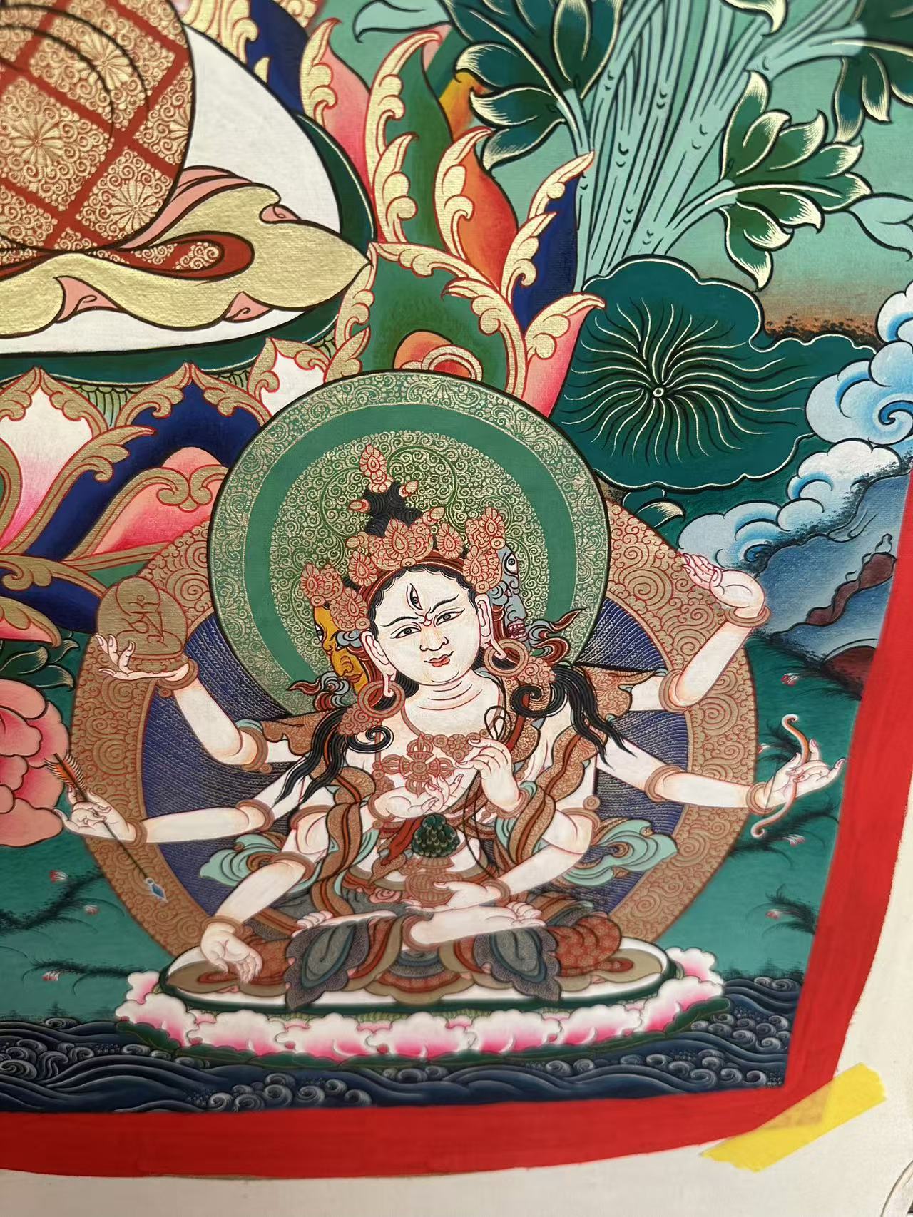 | 唐卡“師傅”開臉,筆路穩(wěn)重流暢。體現(xiàn)完美天人相,可見佛菩薩慈眉善目,賦予唐卡畫像生的靈氣。 | 細(xì)節(jié)決定品質(zhì),點睛之筆不到位影響整體美觀,五官比例不協(xié)調(diào),面目呆板,缺乏靈氣。 |