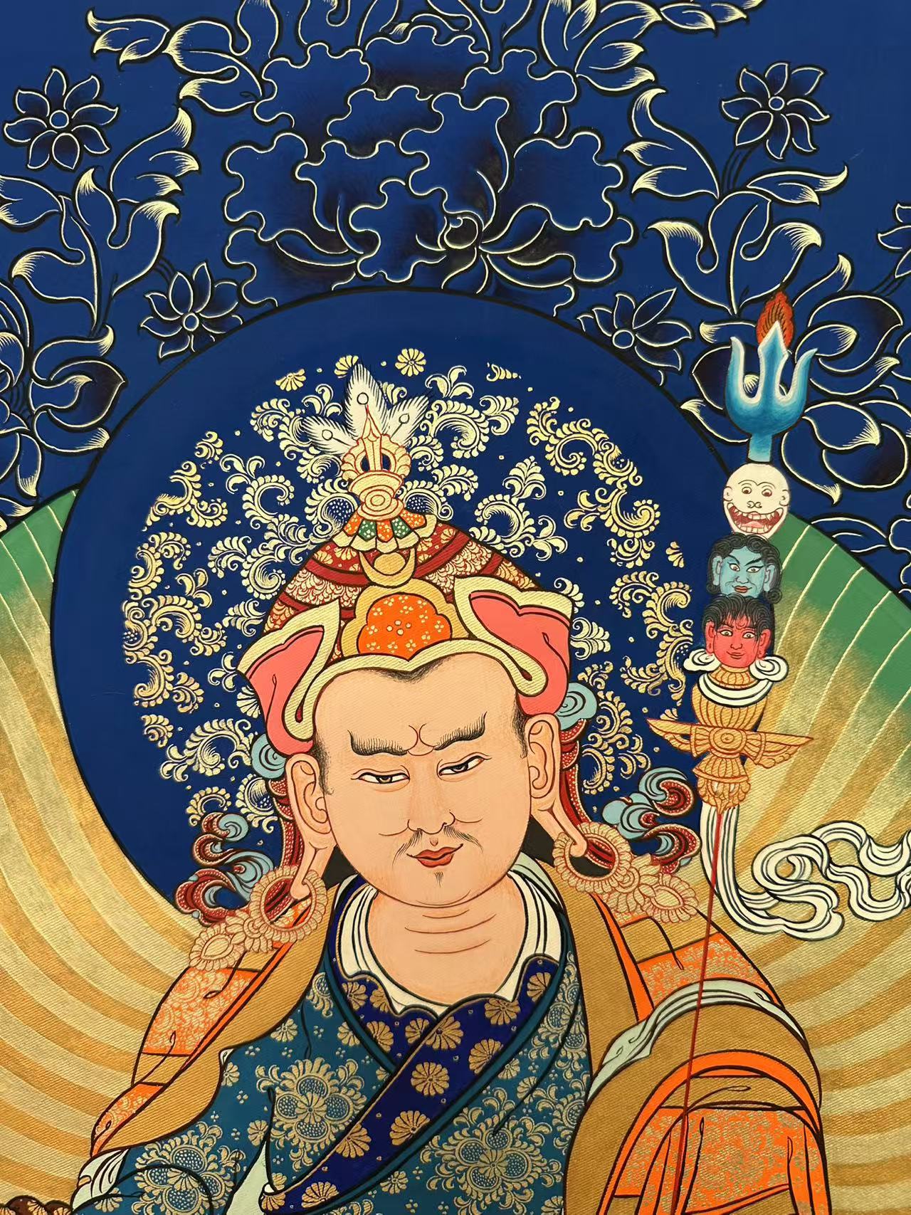 | 唐卡“師傅”開臉,筆路穩(wěn)重流暢。體現(xiàn)完美天人相,可見佛菩薩慈眉善目,賦予唐卡畫像生的靈氣。 | 細(xì)節(jié)決定品質(zhì),點(diǎn)睛之筆不到位影響整體美觀,五官比例不協(xié)調(diào),面目呆板,缺乏靈氣。 |