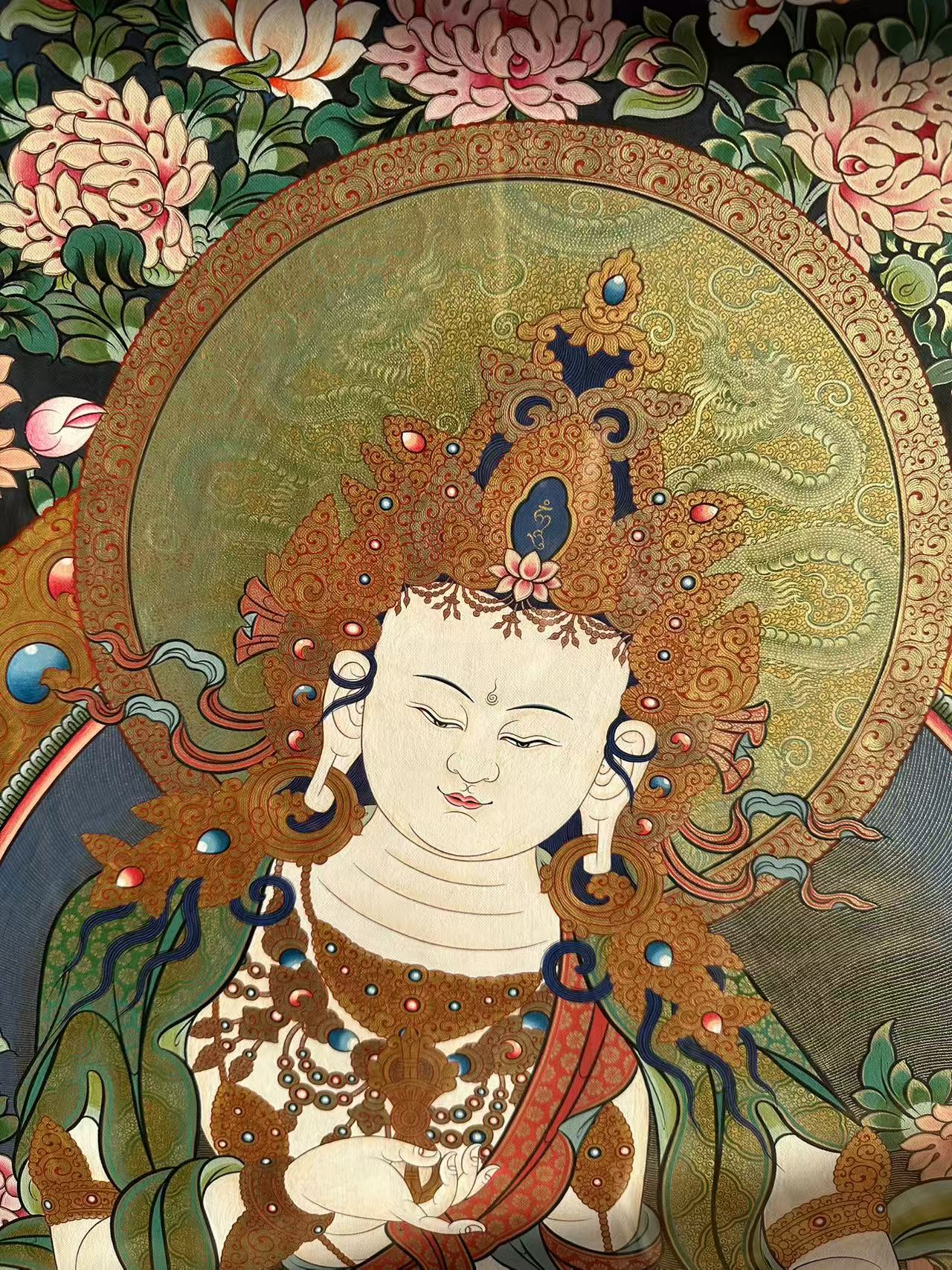 | 唐卡“師傅”開臉,筆路穩(wěn)重流暢。體現完美天人相,可見佛菩薩慈眉善目,賦予唐卡畫像生的靈氣。 | 細節(jié)決定品質,點睛之筆不到位影響整體美觀,五官比例不協(xié)調,面目呆板,缺乏靈氣。 |