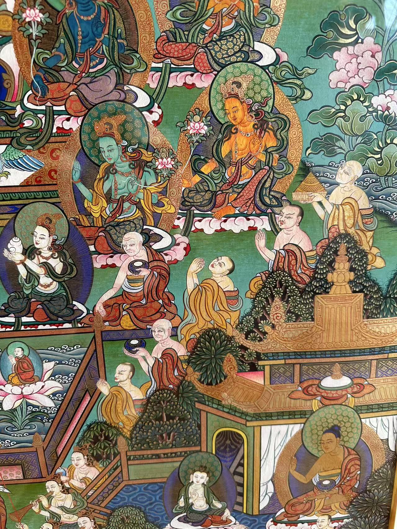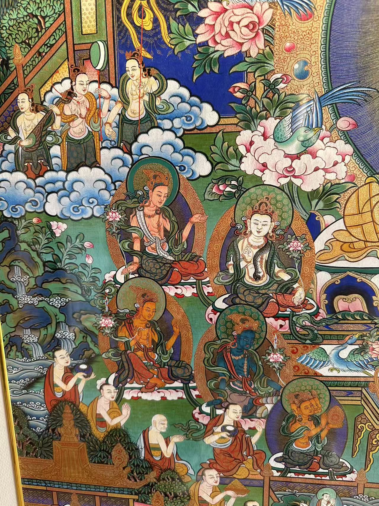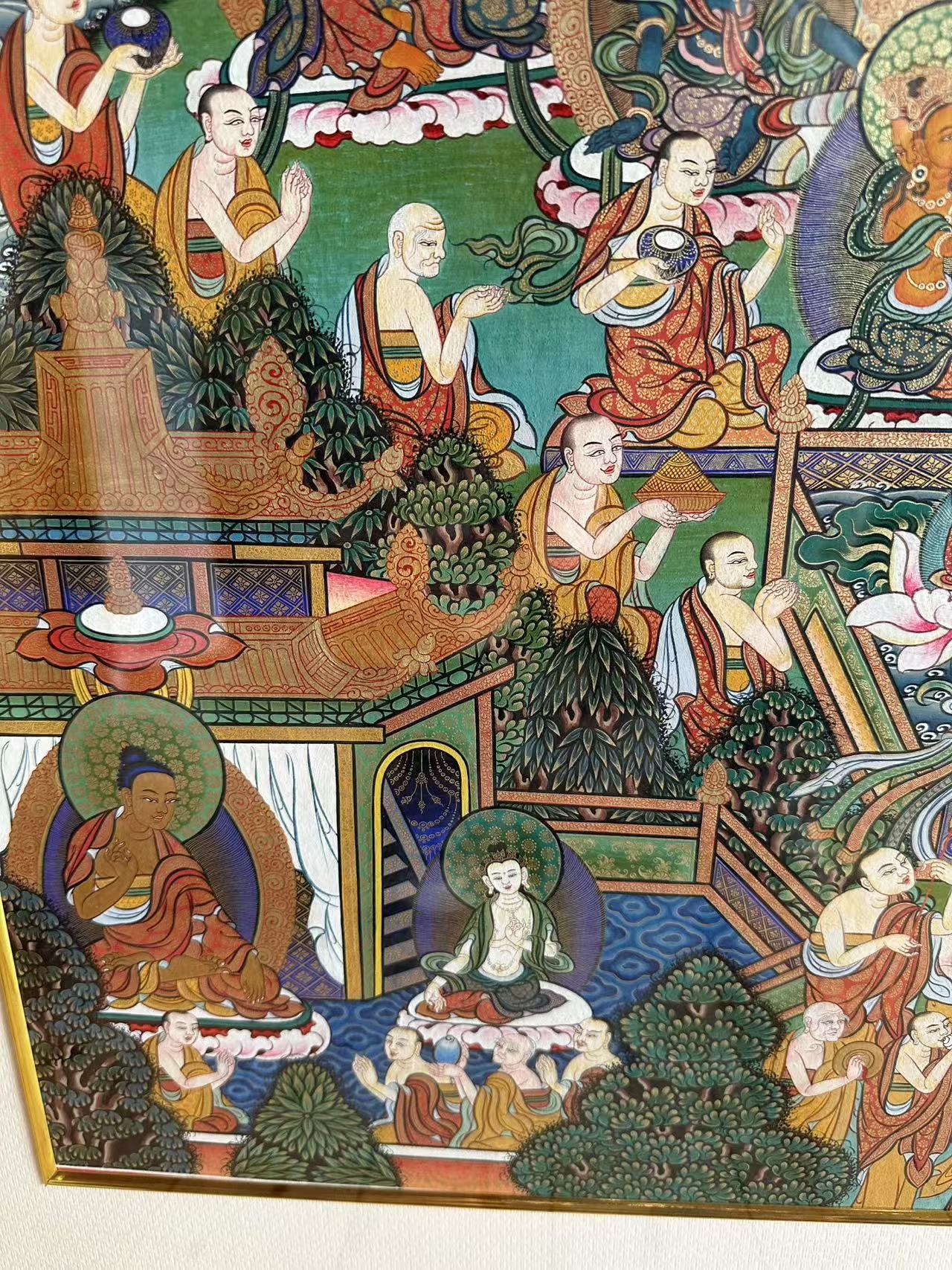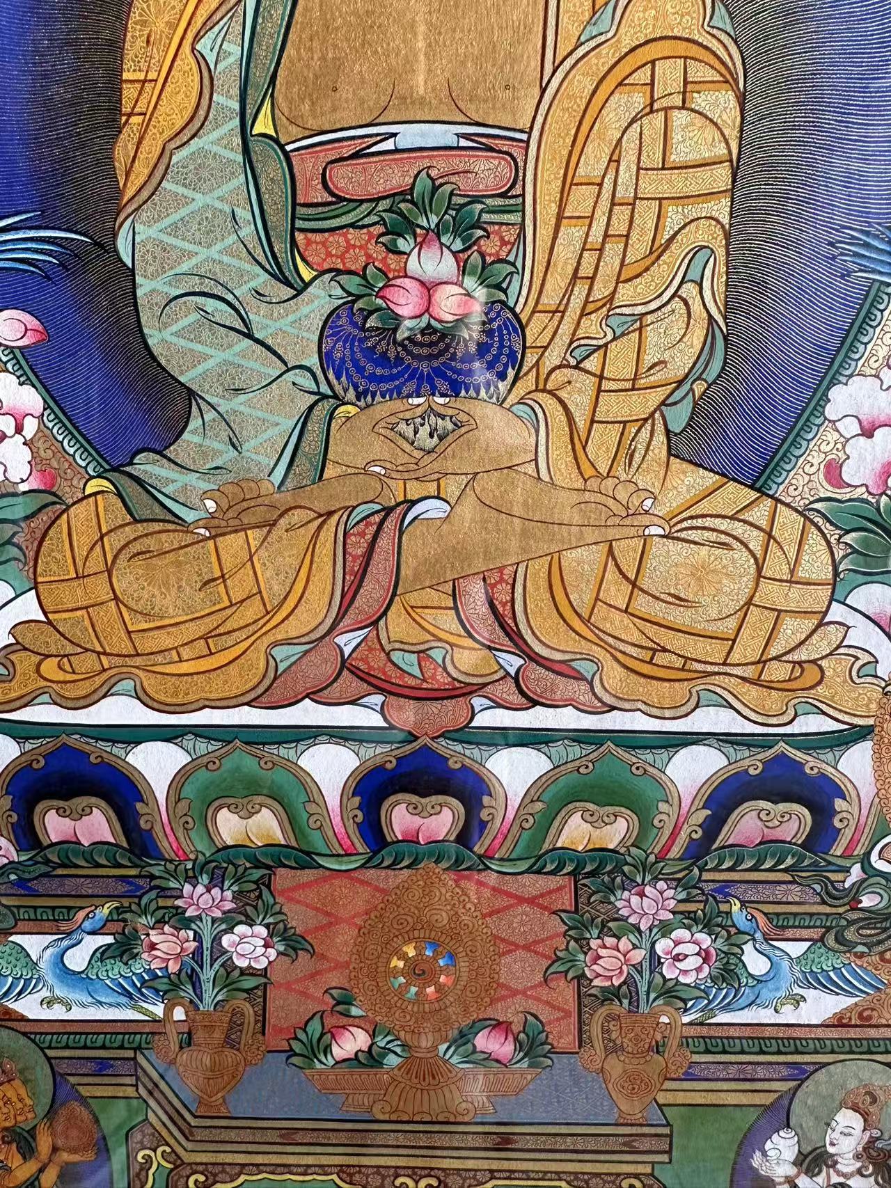 | 唐卡是歷史的瑰寶,現(xiàn)已被例入國家非物質(zhì)文化遺產(chǎn)名錄,得到了高度的重視和保護(hù)。同時由于顏料的珍稀、繪制周期長、工藝復(fù)雜大大增強(qiáng)了其珍藏價值。一幅好的作品可遇不可求,近年來唐卡已成為收藏界炙手可熱的藏品。 | 唐卡的形式便于攜帶,其內(nèi)容體現(xiàn)了藏傳佛教的莊重、神圣、華貴,被稱為“移動的佛像”。同時也是修行者積累善業(yè),追尋心靈的平靜與安寧的一個過程。 | 唐卡的內(nèi)容包羅萬象,它以圖像的方式承載著藏族文化精髓,是藏族智慧的結(jié)晶,廣泛傳播了藏地的文化、歷史和宗教理論。 | 唐卡絢麗的色彩、流暢的線條、嚴(yán)謹(jǐn)?shù)慕Y(jié)構(gòu),都充滿著濃郁的高原和游牧民族風(fēng)情,無疑是難得的藝術(shù)珍品。值得一提的是唐卡繪制顏料全部為天然礦物顏料,畫面效果艷麗,可以保存千年而不變色。 |