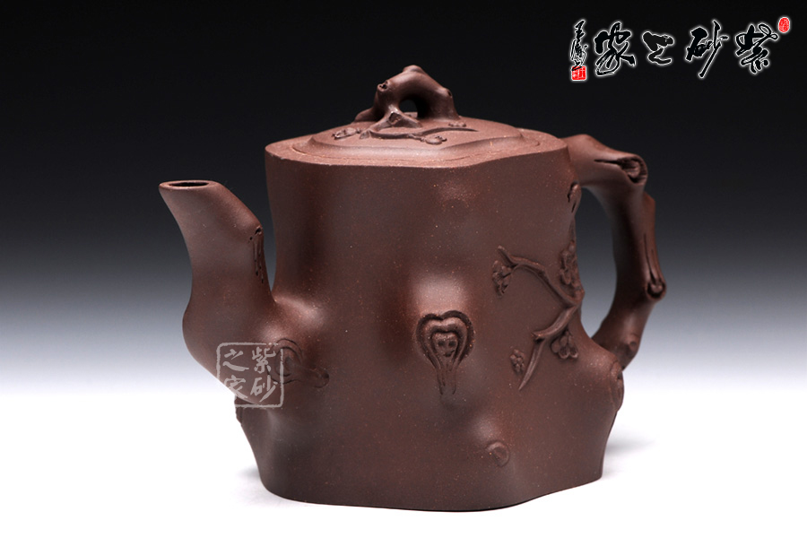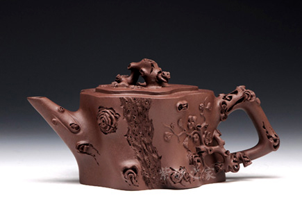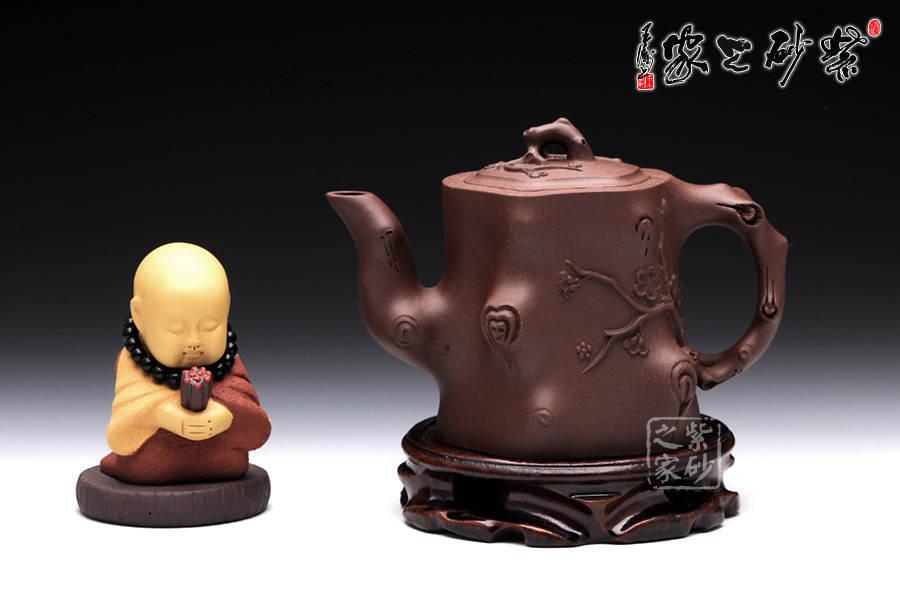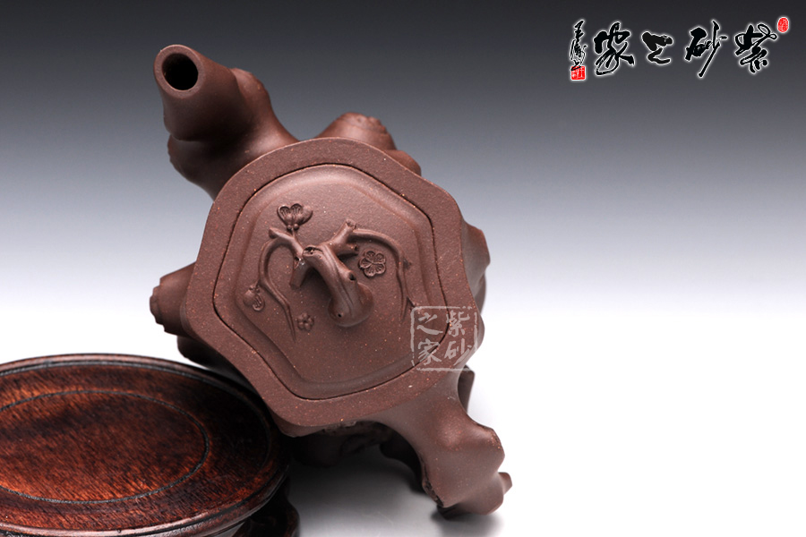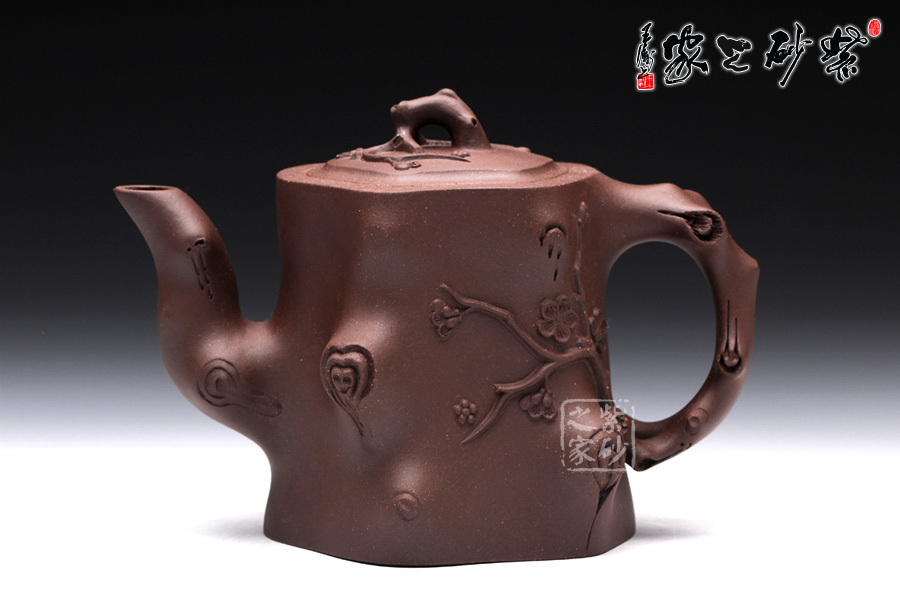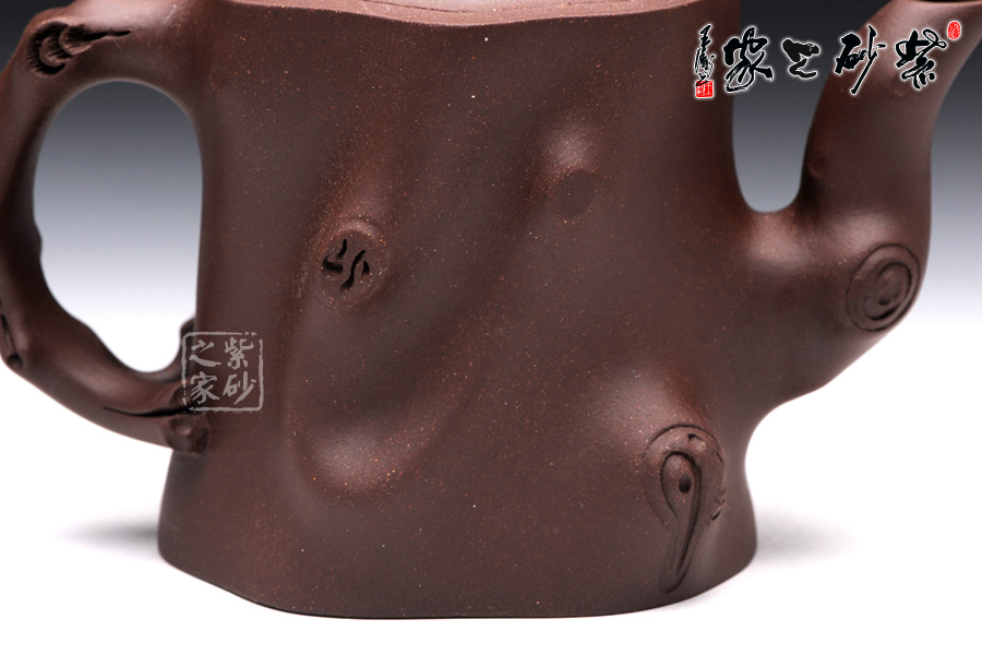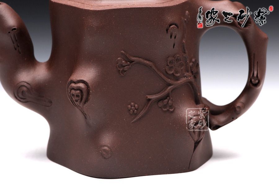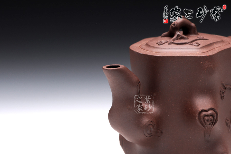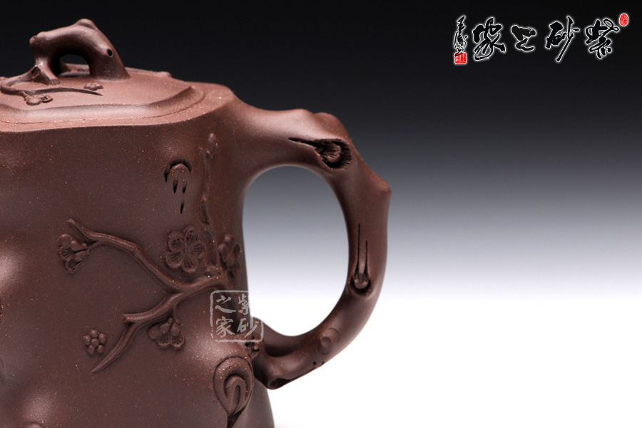 “傲骨百花妒,高風(fēng)座上賓。有心勤吐蕊,無意苦爭春。本是凡間物,兼修事外身。笑迎三尺雪,十里漫香淳。”這是對梅花贊美。此小梅樁,即是以梅花為原型構(gòu)思創(chuàng)作的壺,堪稱經(jīng)典之作,寓意深刻。該壺通身被梅花的枝和花裝飾,精美雅致。壺身像木樁,親切自然,外表酷似梅枝的表皮,凸凹不平,蒼勁古樸。壺鈕以一顆小梅樹為形,彎曲如拱橋,精巧別致。端把也以梅樹為形,自然彎曲如耳狀,和壺身相接,于端把下方貼近壺身的地方伸出了一簇梅花,有的含苞待放,有的鮮艷綻開,仿若一股暗香正迎面而來,沁人心脾。此外,精選原礦紫泥制成的此壺,柔和細(xì)膩的色澤中,更顯古樸端莊,雅韻無窮。此壺,值得欣賞和把玩!