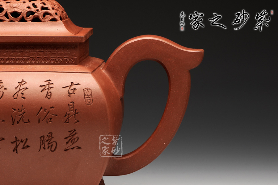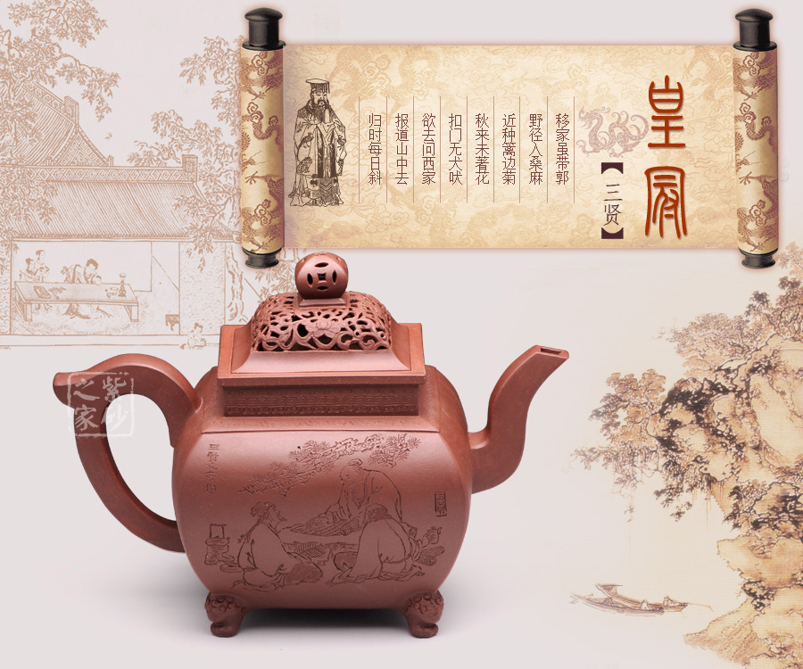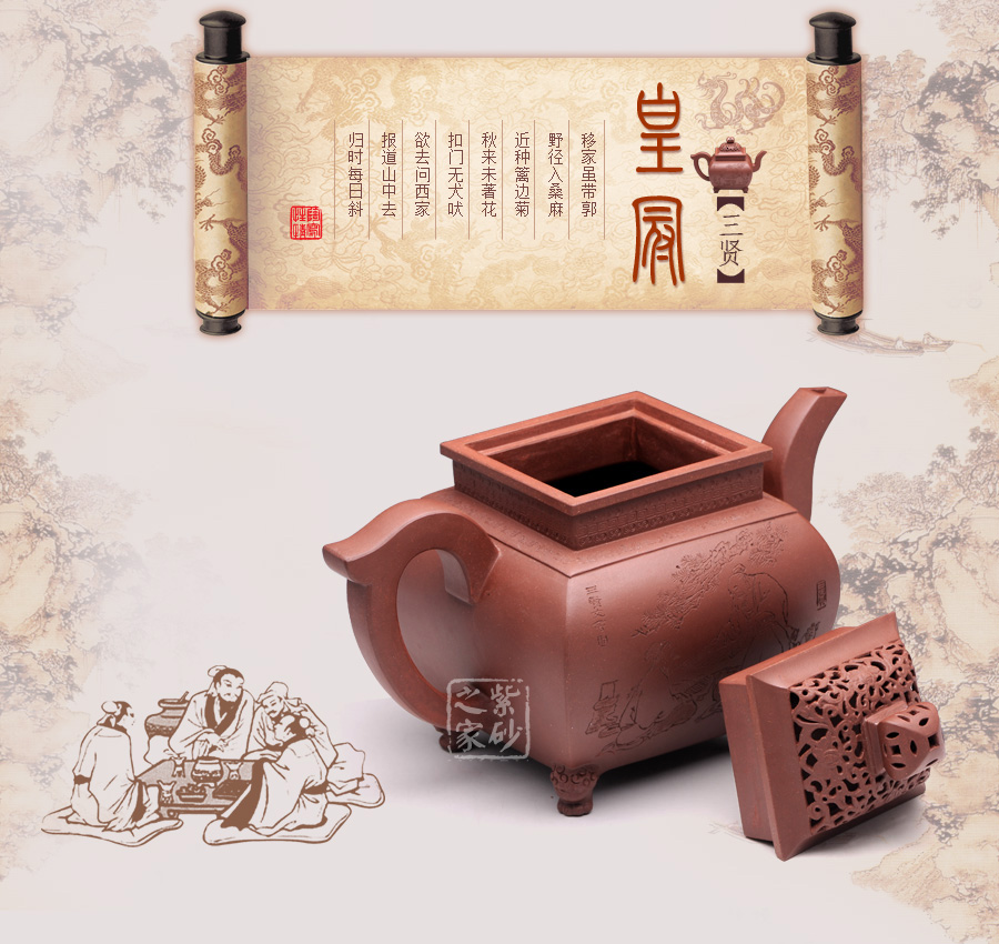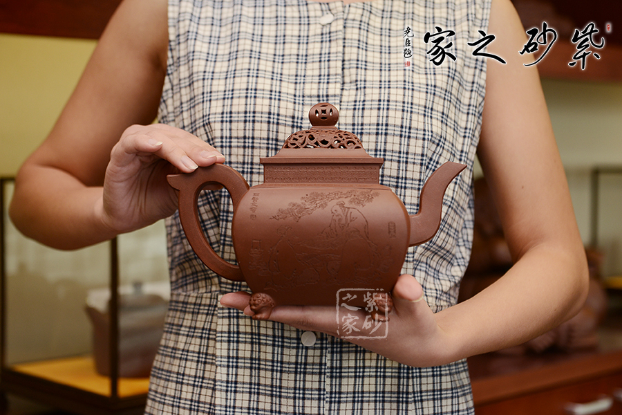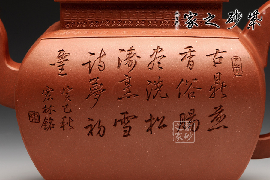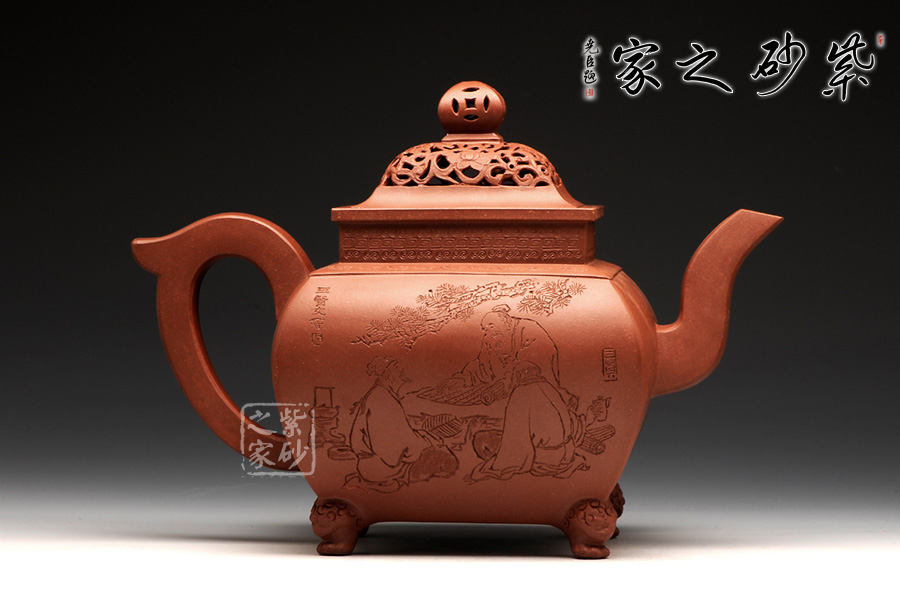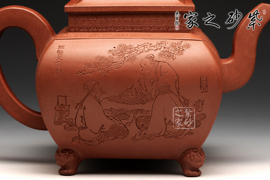 此壺,端莊大氣,古樸風(fēng)雅。壺蓋和壺鈕采用鏤雕裝飾工藝,造型精致美觀,足見制壺者的工藝之精湛。此壺方中寓圓, 具有吞吐四方之勢(shì),大氣磅礴。壺嘴骨干硬朗,方形線條呈三彎流蜿蜒上翹,俊健修長(zhǎng),和耳形壺把相互應(yīng)和。壺正面刻繪的是“ 古鼎煎香俗腸盡洗,松濤烹雪詩夢(mèng)初靈”,品茗的樂趣和意義盡在話語間。壺背面刻繪的是三賢交會(huì)圖:三位居士,神態(tài)各異,一起高談闊論,品茗論文,悠閑自得,歡快暢然,韻味無窮。此壺,值得推薦!
