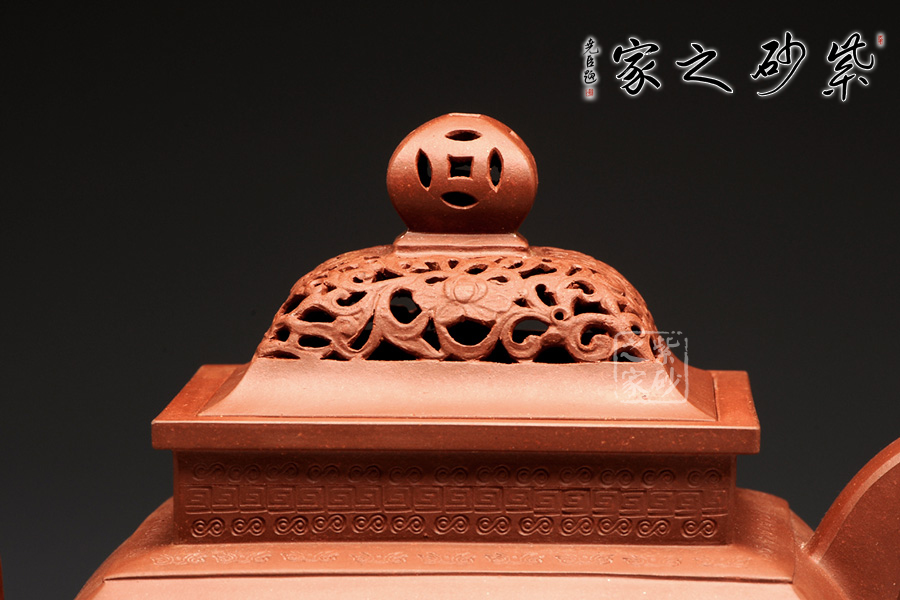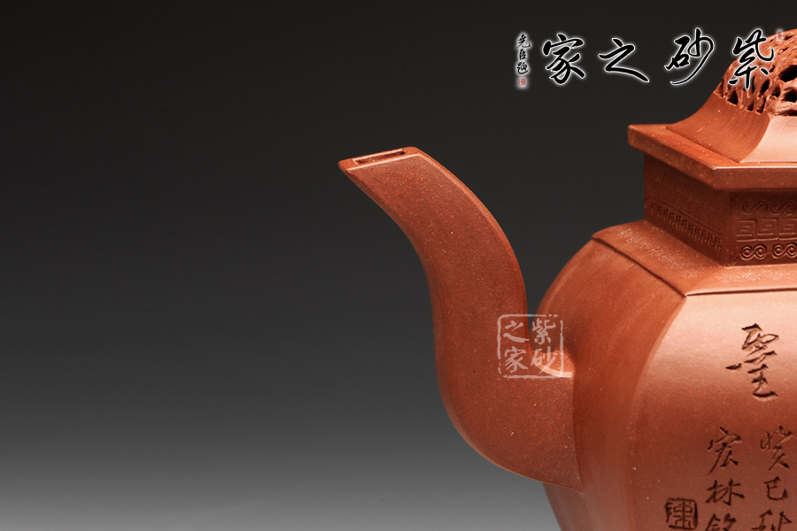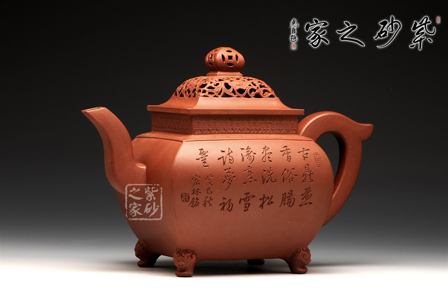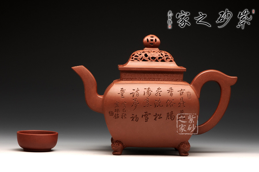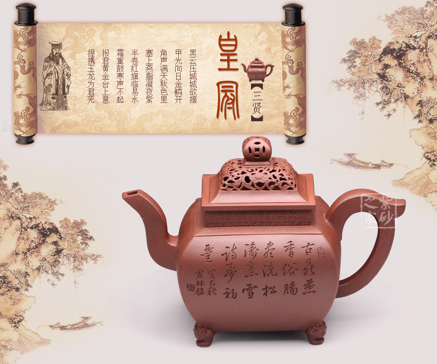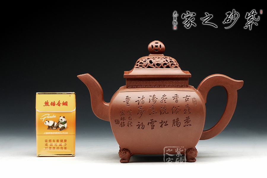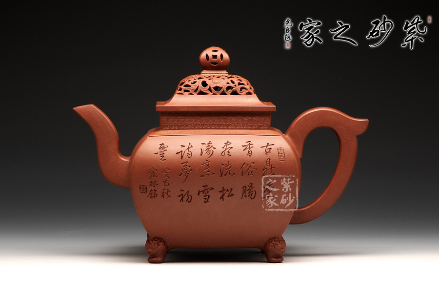 此壺,端莊大氣,古樸風(fēng)雅。壺蓋和壺鈕采用鏤雕裝飾工藝,造型精致美觀,足見制壺者的工藝之精湛。此壺方中寓圓, 具有吞吐四方之勢(shì),大氣磅礴。壺嘴骨干硬朗,方形線條呈三彎流蜿蜒上翹,俊健修長(zhǎng),和耳形壺把相互應(yīng)和。壺正面刻繪的是“ 古鼎煎香俗腸盡洗,松濤烹雪詩夢(mèng)初靈”,品茗的樂趣和意義盡在話語間。壺背面刻繪的是三賢交會(huì)圖:三位居士,神態(tài)各異,一起高談闊論,品茗論文,悠閑自得,歡快暢然,韻味無窮。此壺,值得推薦!