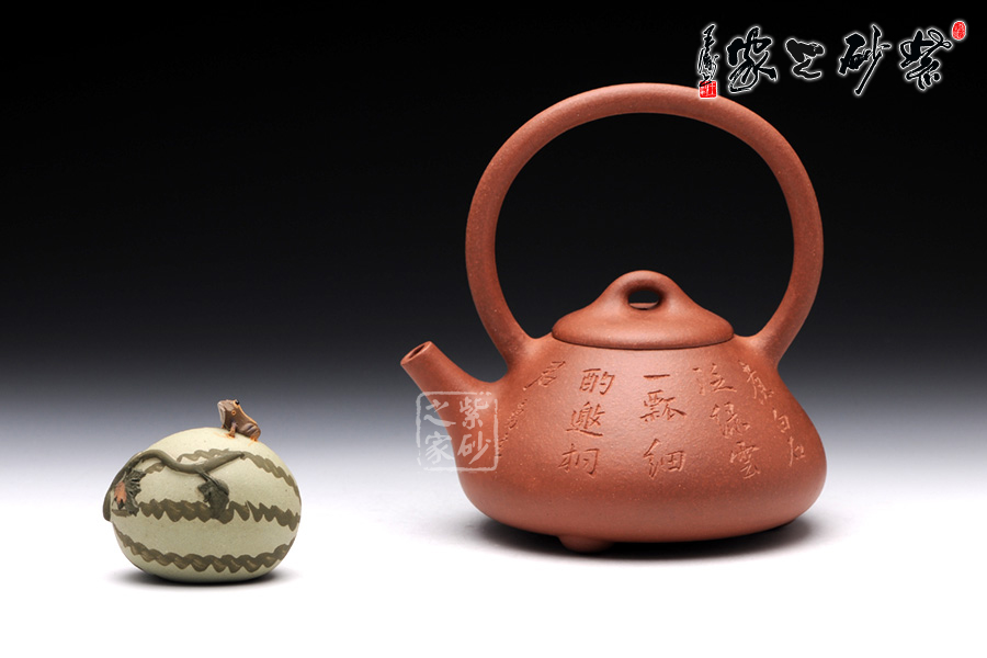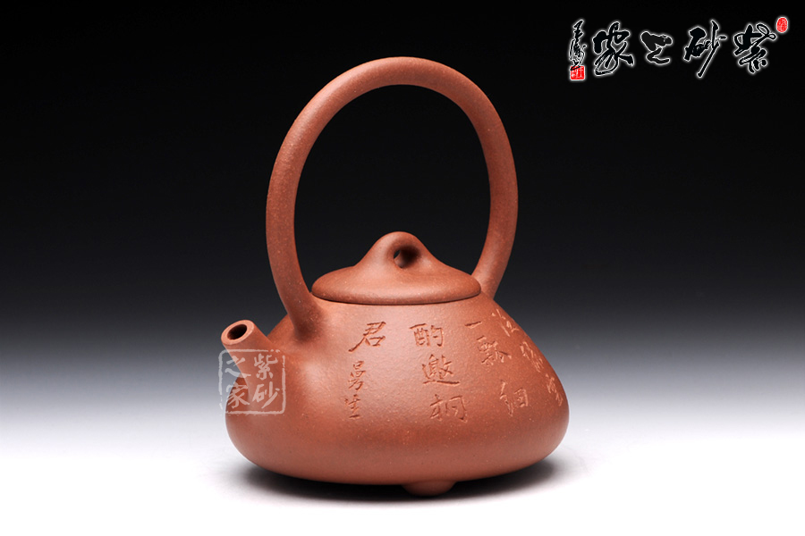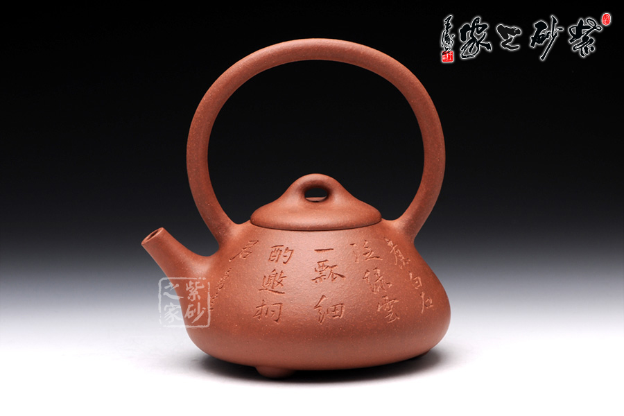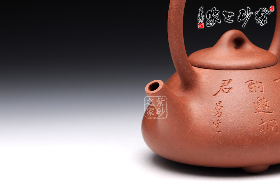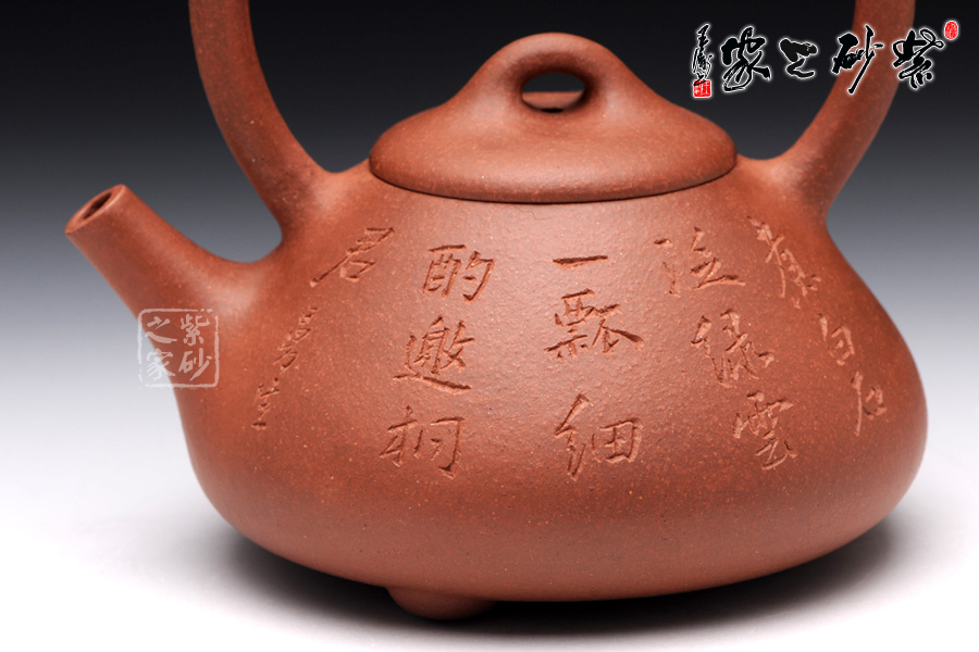 此壺是精選原礦降坡泥制成的石瓢提梁,色則潤(rùn)紅,古味深藏。石瓢瓢提梁是紫砂壺經(jīng)典壺型之一。該壺器形敦厚,大氣渾厚,線(xiàn)條流暢飽滿(mǎn),提梁的空間感處理頗好,虛實(shí)結(jié)合,妙韻渾然天成。壺身正面,清淺刻繪“煮白石泛綠云,一瓢細(xì)酌邀相君”兩行小詩(shī),整款壺仿若有了靈魂,一種閑適的生活狀態(tài)和清雅的生活情趣漾然于壺間,值得玩味!
