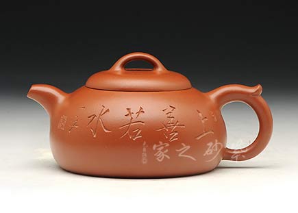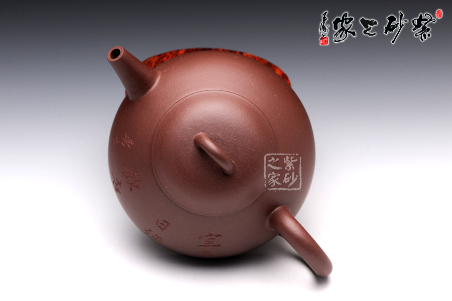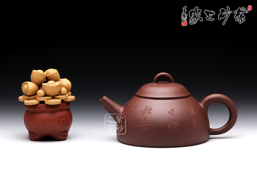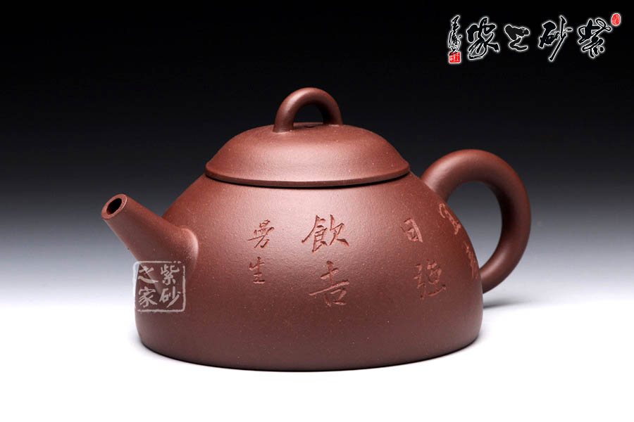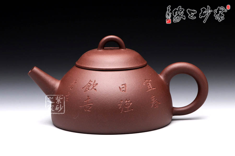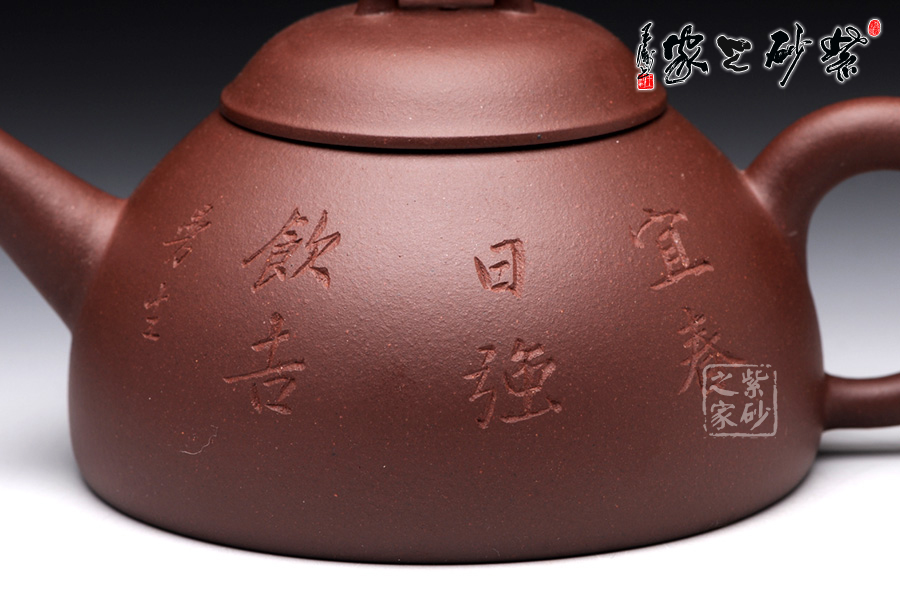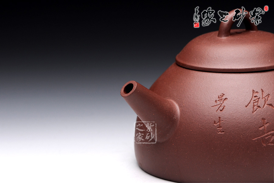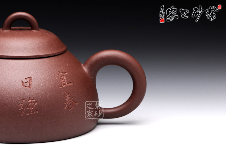 此壺以半瓢為器身,流短而直,把成環(huán)形,蓋上設(shè)弧鈕,造型設(shè)計簡潔大方。整款壺由上而下依次變大,至壺底呈最大接觸面,因此器型極為穩(wěn)健,成為極為穩(wěn)重的形態(tài)。壺蓋、蓋鈕與腹呈相似的壺型,壺柄略微呈倒耳狀,典雅古樸,造型樸掘。該壺正面采用刻繪裝飾工藝篆刻了“宜春日強飲吉”,交代此壺飲茶的最佳時間,于古韻中盡顯溫馨。此外,古語有云:“文以簡為貴”、“畫以簡為貴”,對于紫砂愛好者來說。此壺是收藏和把玩的佳品。